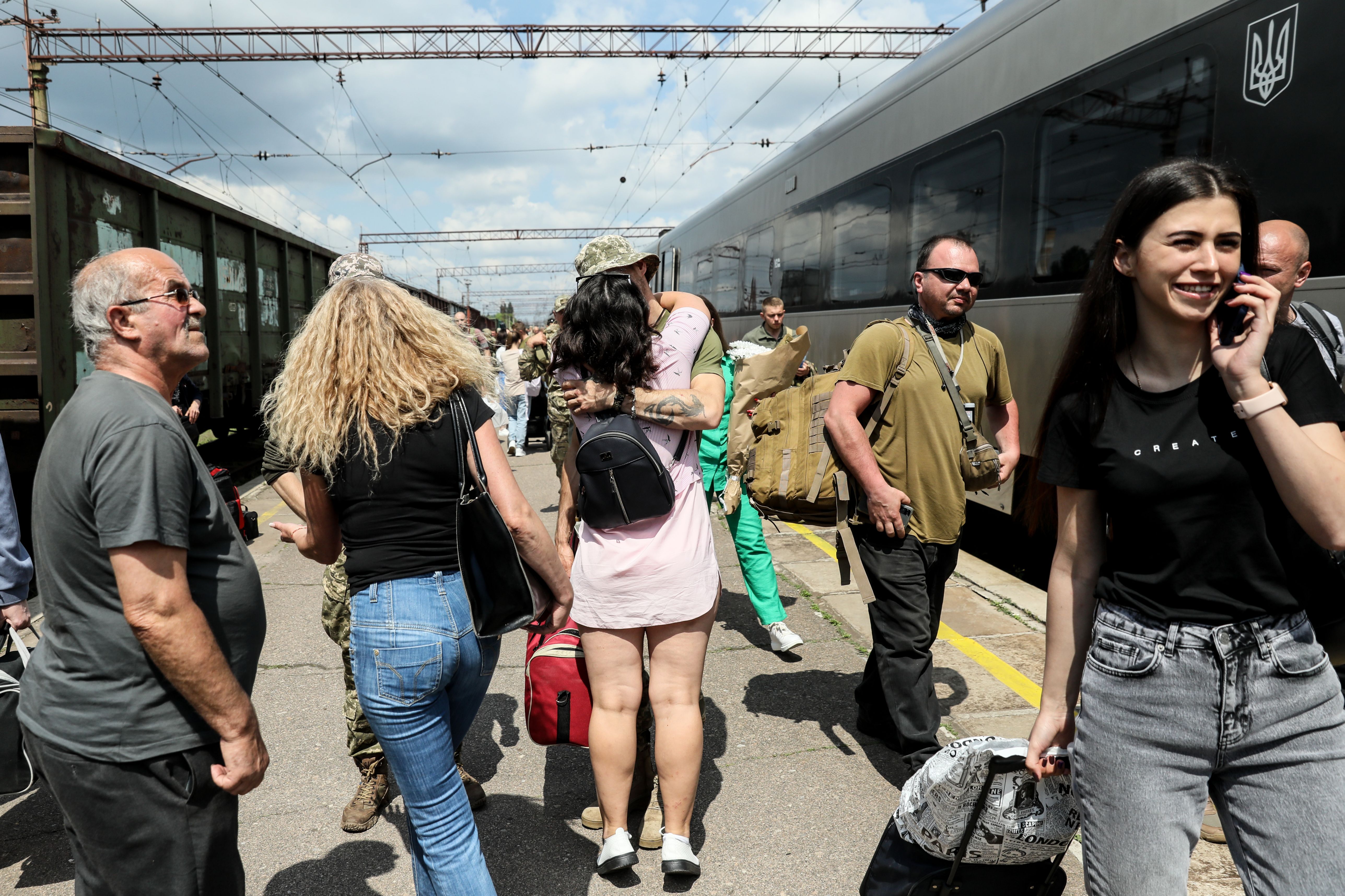 A couple (C) meets at the railway station in Kramatorsk, Donetsk region, Ukraine, 28 May 2023. Under martial law, Ukrainian servicemen are entitled to 10 days of vacation per year. Some of their family members travel to areas closer to the frontline to make the most out of the short time they have available to spend with servicemen, while they’re on a rotational leave. Russian troops entered Ukraine in February 2022, starting a conflict that has provoked destruction and a humanitarian crisis. (Photo by Oleg Petrasyuk/EPA/EFE)