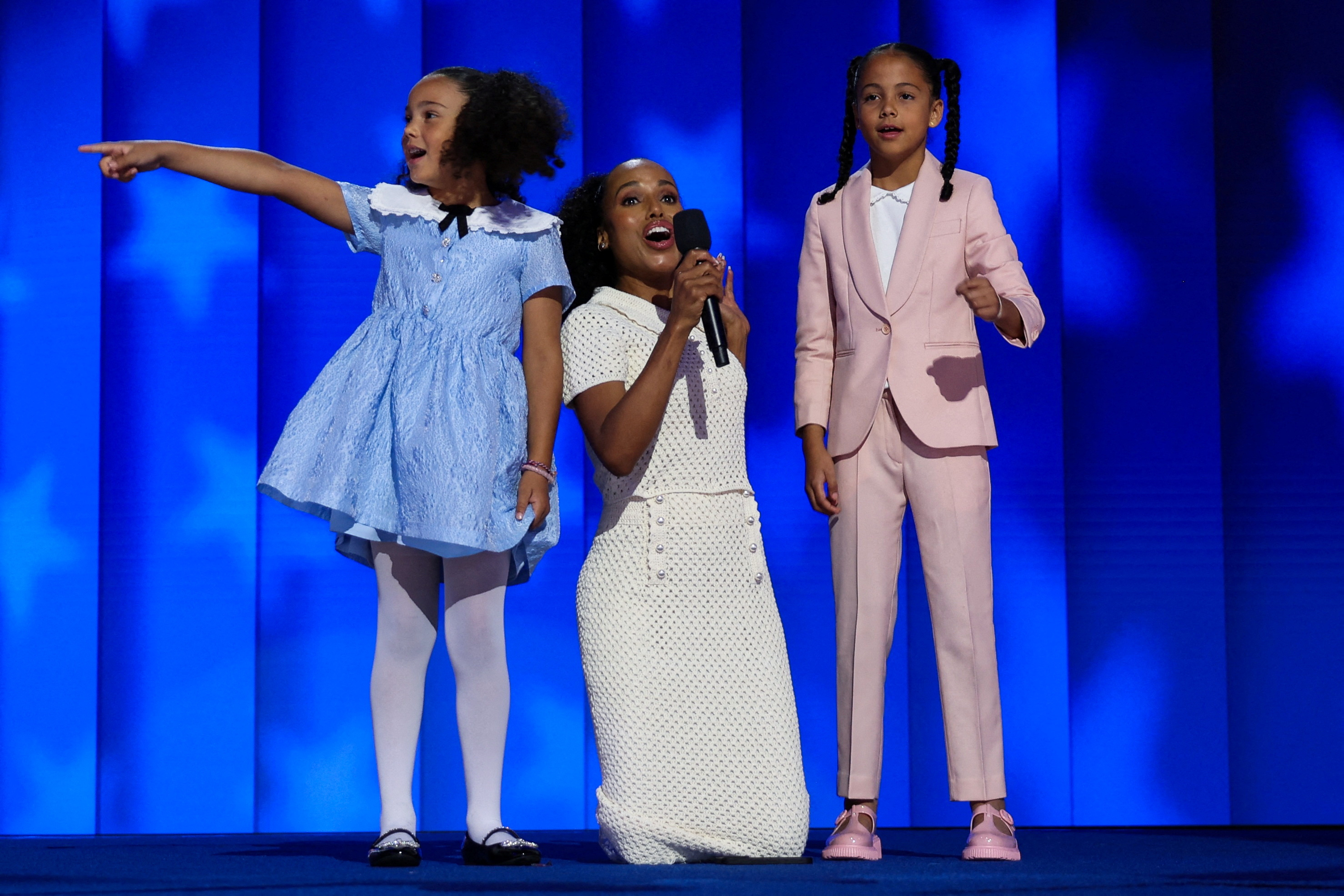 Kerry Washington, center, with grand-nieces of Vice President Kamala Harris Amara Ajagu, right, and Leela Ajagu, speak during the Democratic National Convention Thursday, August 22, 2024, in Chicago. (Photo by Kevin Wurm/Reuters)