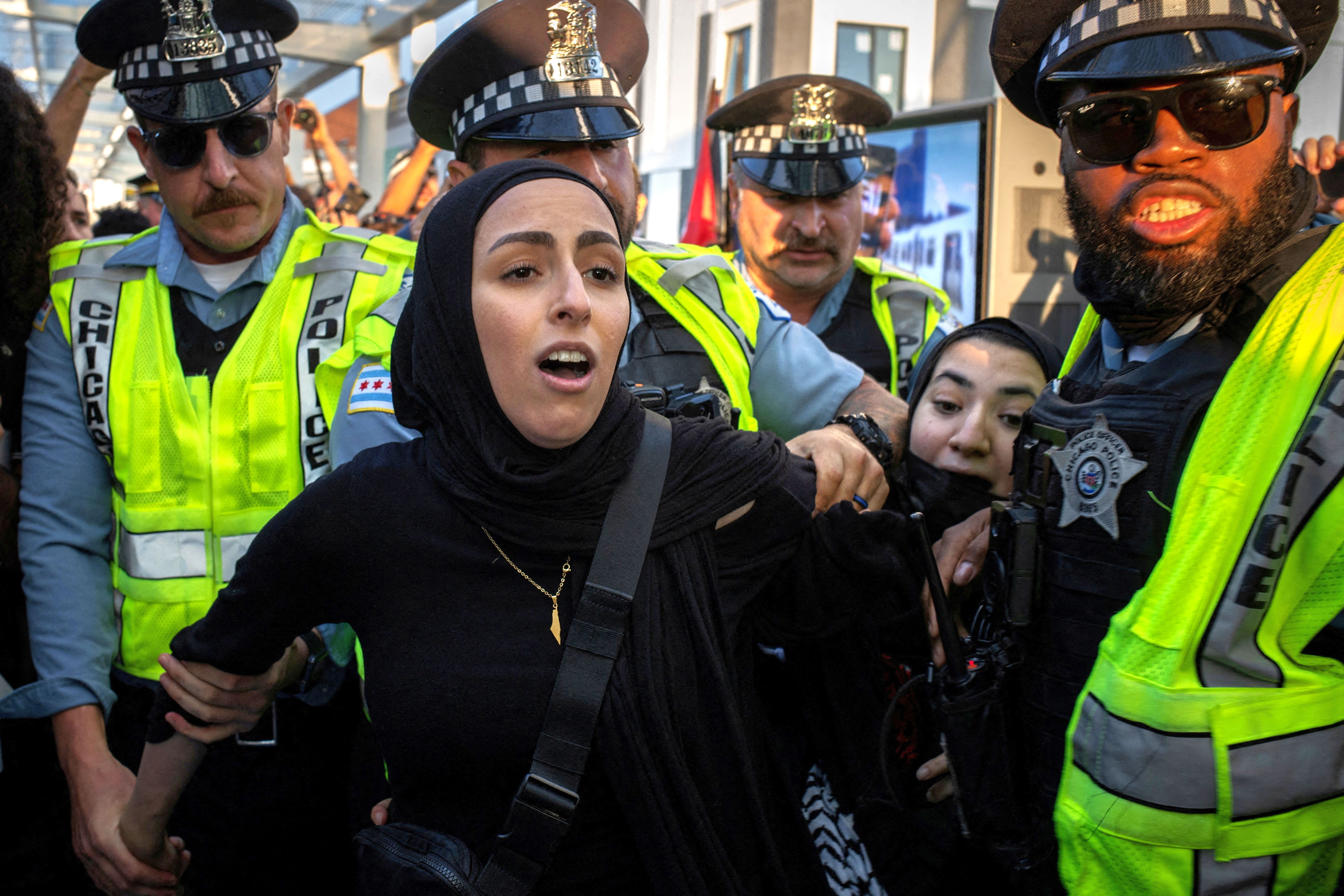 Women wearing hijab, who were photographing a pro-Palestinian protest march, are detained by police along the Damen train station platform, on sidelines of the Democratic National Convention in Chicago on August 21, 2024. (Photo by Adrees Latif/Reuters)