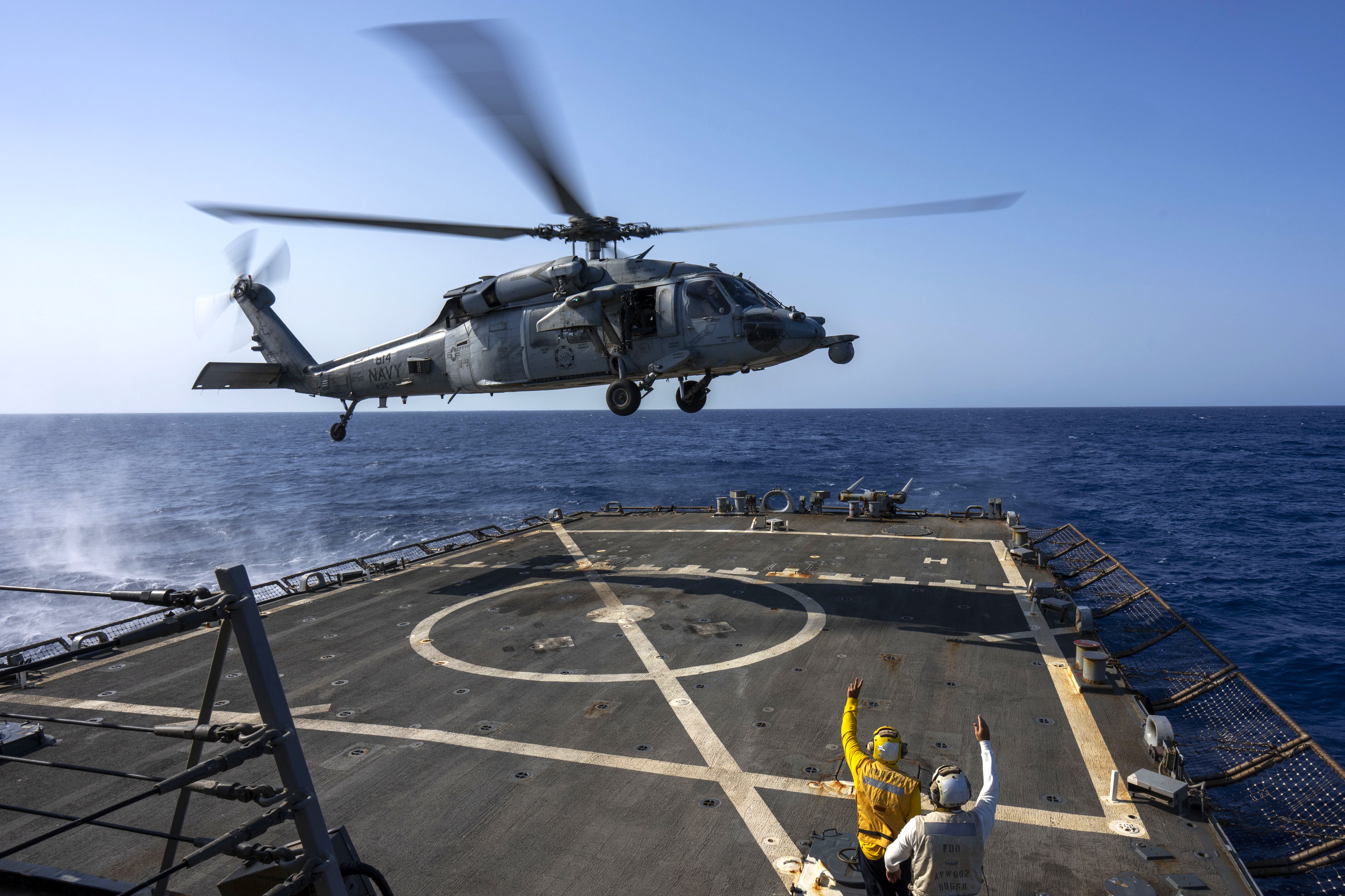 An HSC-7 helicopter lands on the Arleigh Burke-class guided missile destroyer USS Laboon in the Red Sea, Wednesday on June 12, 2024. (Photo by Bernat Armangue/AP Photo)