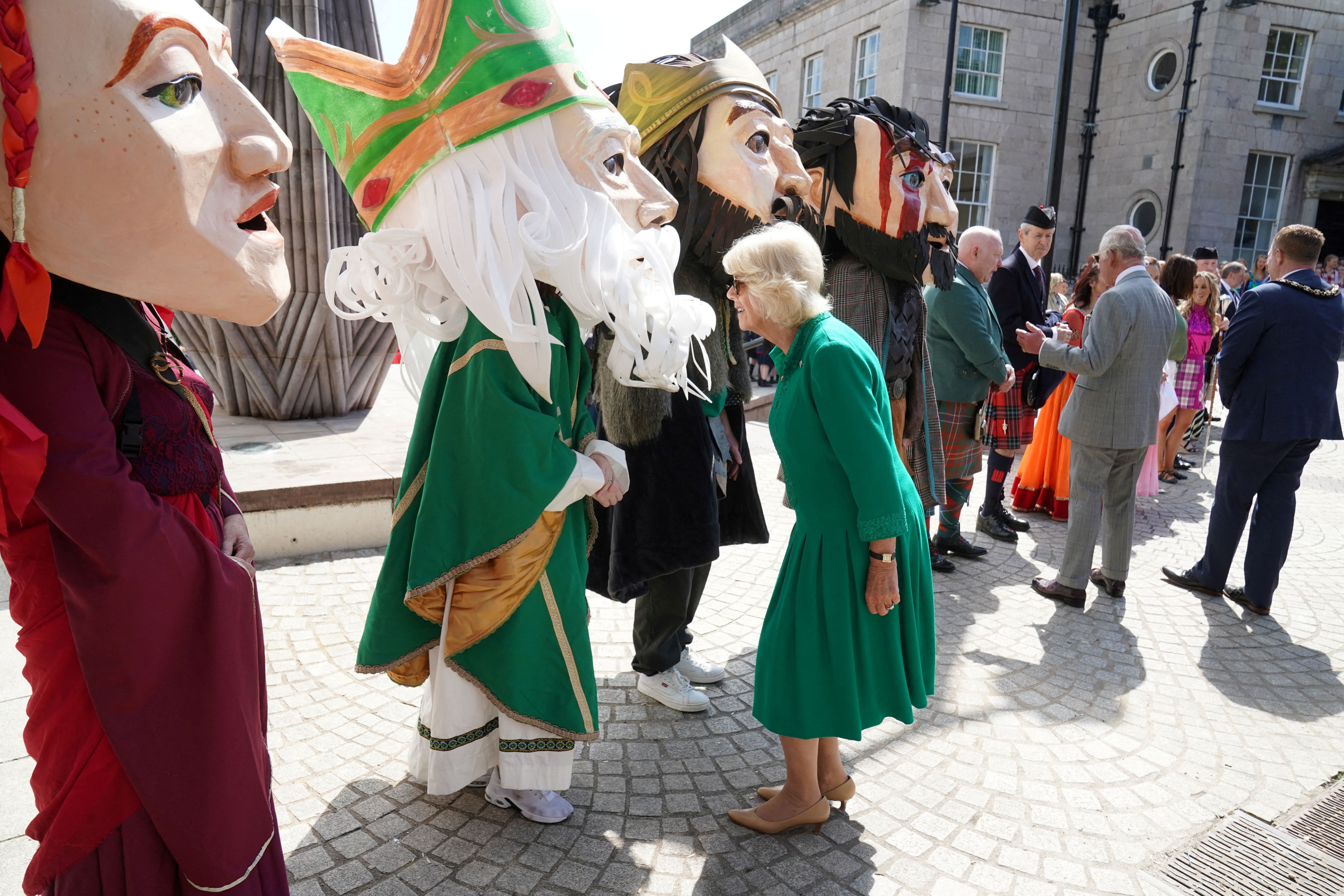 King Charles III and Queen Camilla meets characters representing legendary and historical characters associated with Armagh during a visit to Market Theatre Square, Armagh, Co Armagh as part of a two day visit to Northern Ireland on Thursday, May 25, 2023. (Photo by Brian Lawless/Pool via Reuters)