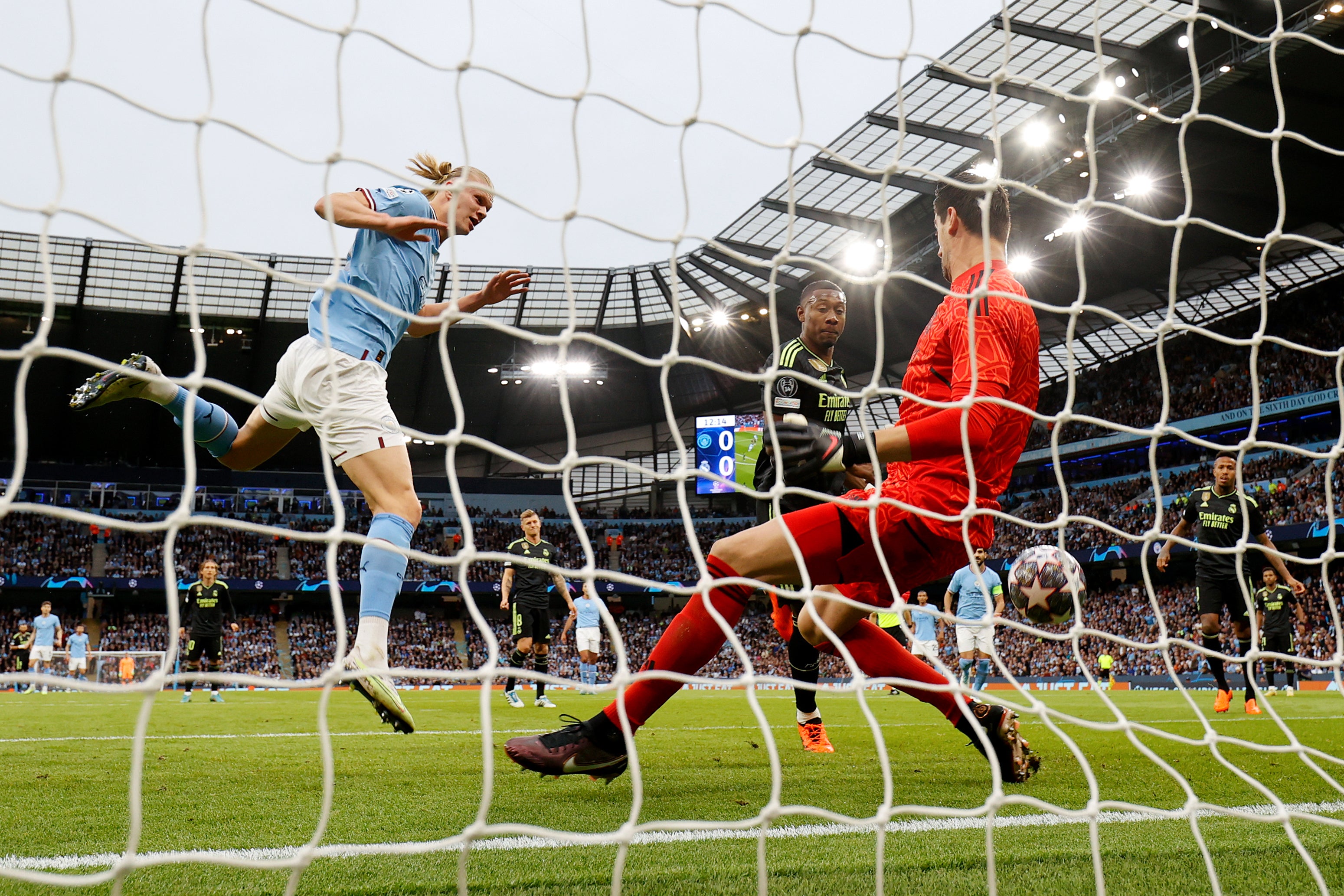 Thibaut Courtois and David Alaba of Real Madrid clear the ball from Erling Haaland of Manchester City during the UEFA Champions League semi-final second leg match between Manchester City FC and Real Madrid at Etihad Stadium on May 17, 2023 in Manchester, England. (Photo by Clive Brunskill/Getty Images)