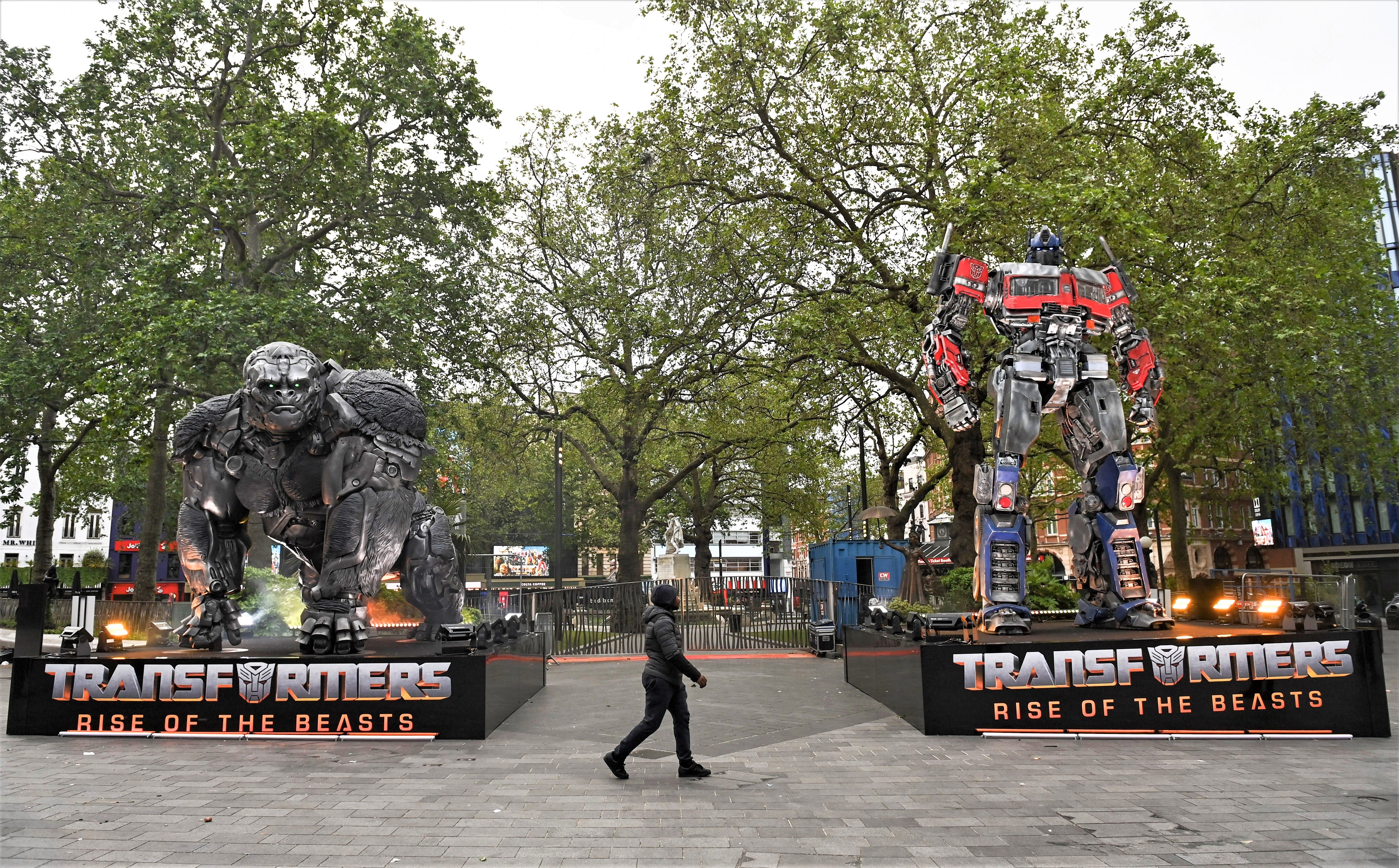 Transformers statues of Autobot leader Optimus Prime and Maximal leader Optimus Primal have been unveiled to mark the release of “Transformers: Rise of the Beasts” at Leicester square at on May 26, 2023 in London, England. In cinemas June 8th. (Photo by Kate Green/Getty Images for Paramount Pictures UK)