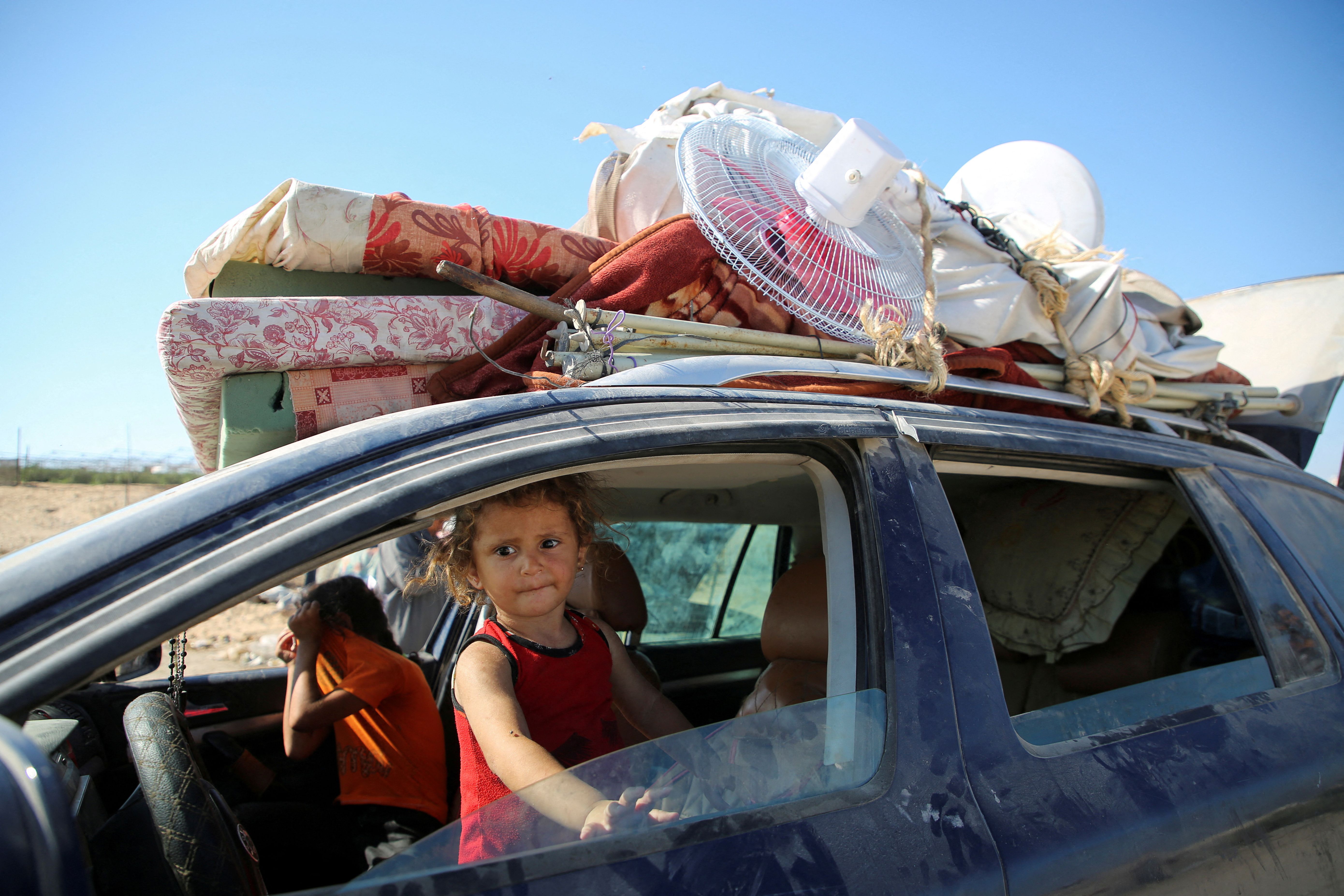A child looks out of a vehicle, as displaced Palestinians flee Hamad City following an Israeli evacuation order, amid the Israel-Hamas conflict, in Khan Younis in the southern Gaza Strip, on August 16, 2024. (Photo by Hatem Khaled/Reuters)