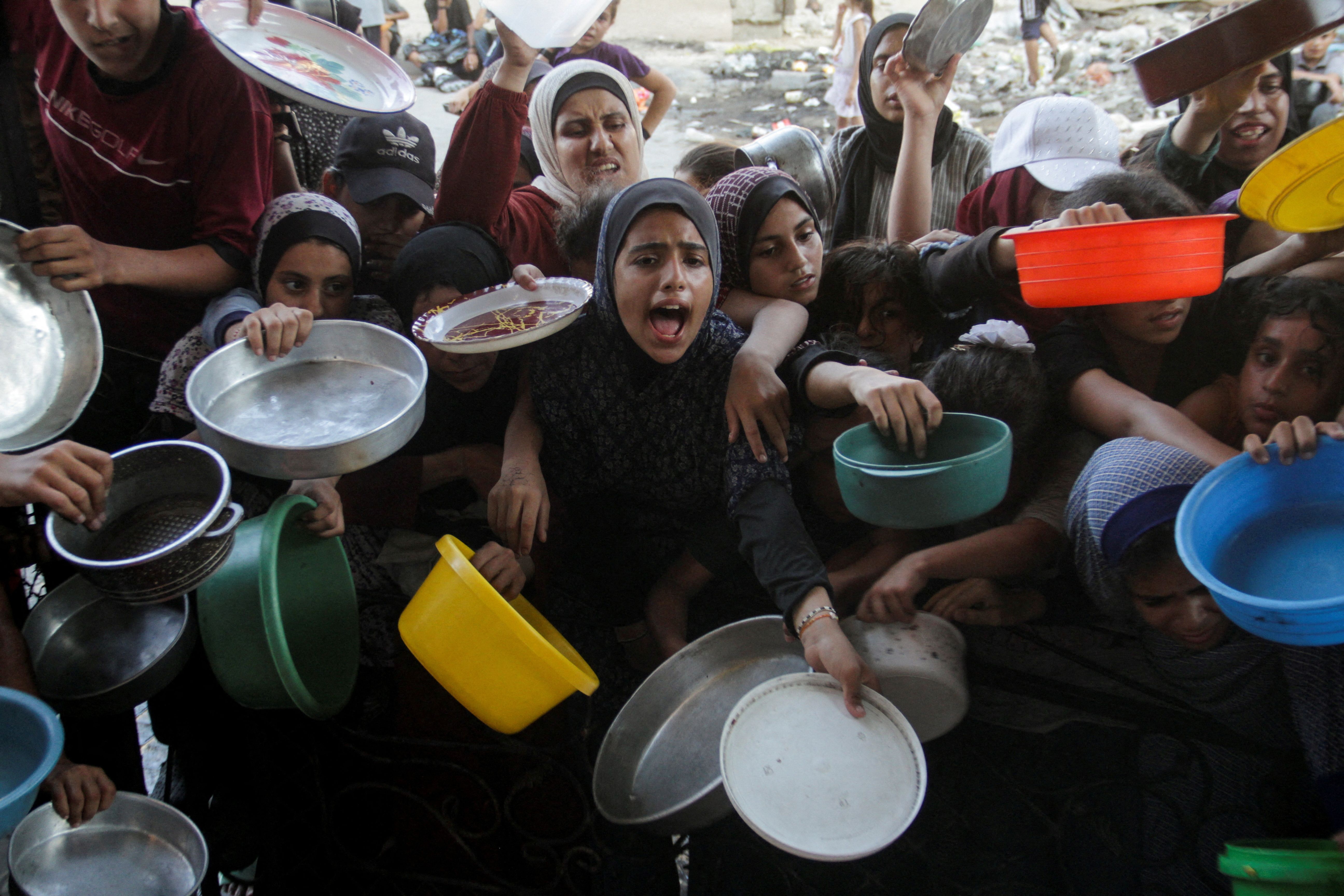 Palestinians react as they wait to receive food cooked by a charity kitchen, amid a hunger crisis as conflict between Israel and Hamas continues, in the northern Gaza Strip on August 14, 2024. (Photo by Mahmoud Issa/Reuters)