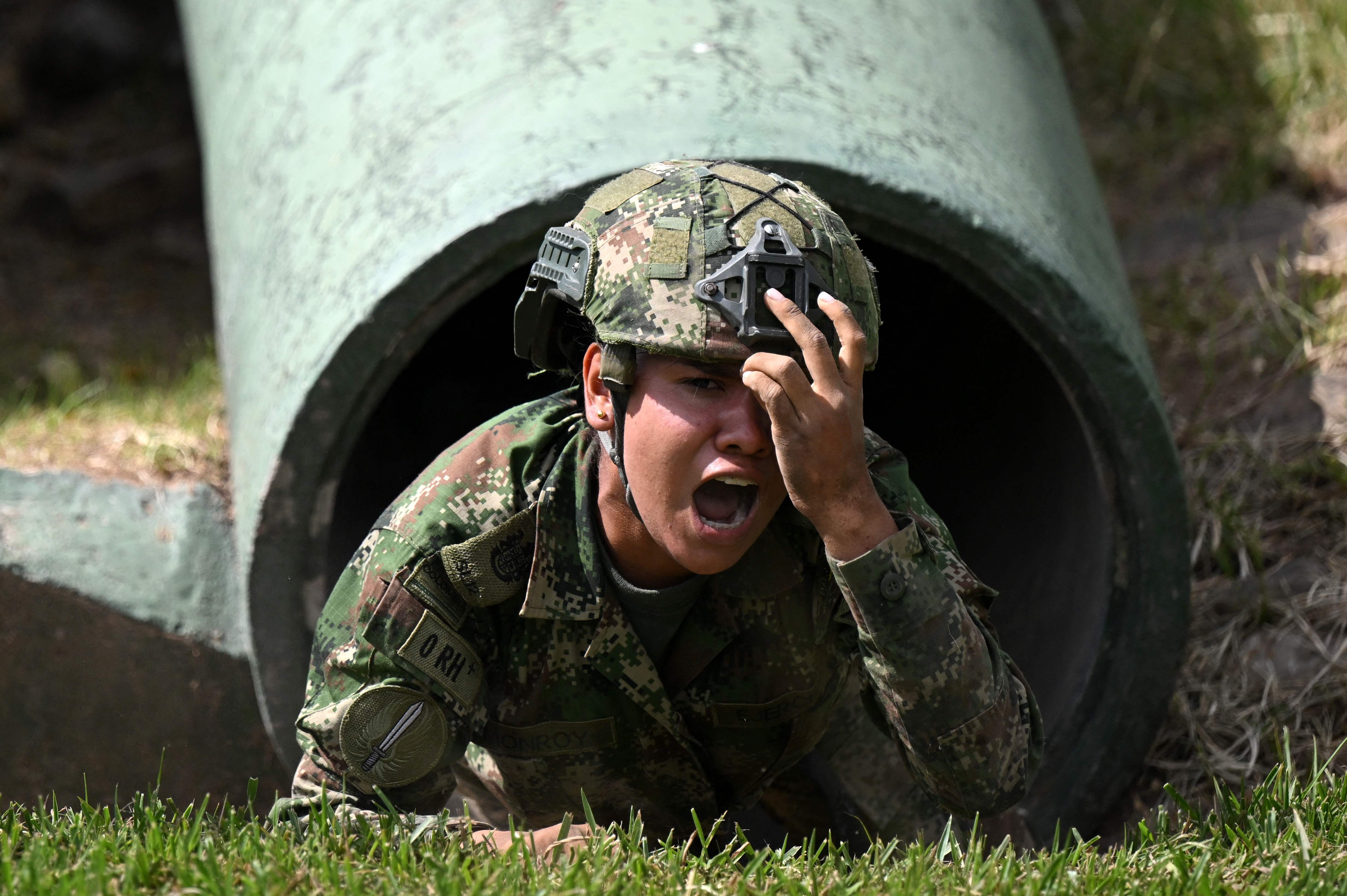 A female soldier takes part in a training for women at the Tolemaida Military Air Base in Tolemaida, Colombia, on May 16, 2023. The last time the Colombian Army enlisted women in their ranks was in 1993. Now, 30 years on, more than 1,200 women voluntarily joined the military service in the country. (Photo by Raul Arboleda/AFP Photo)