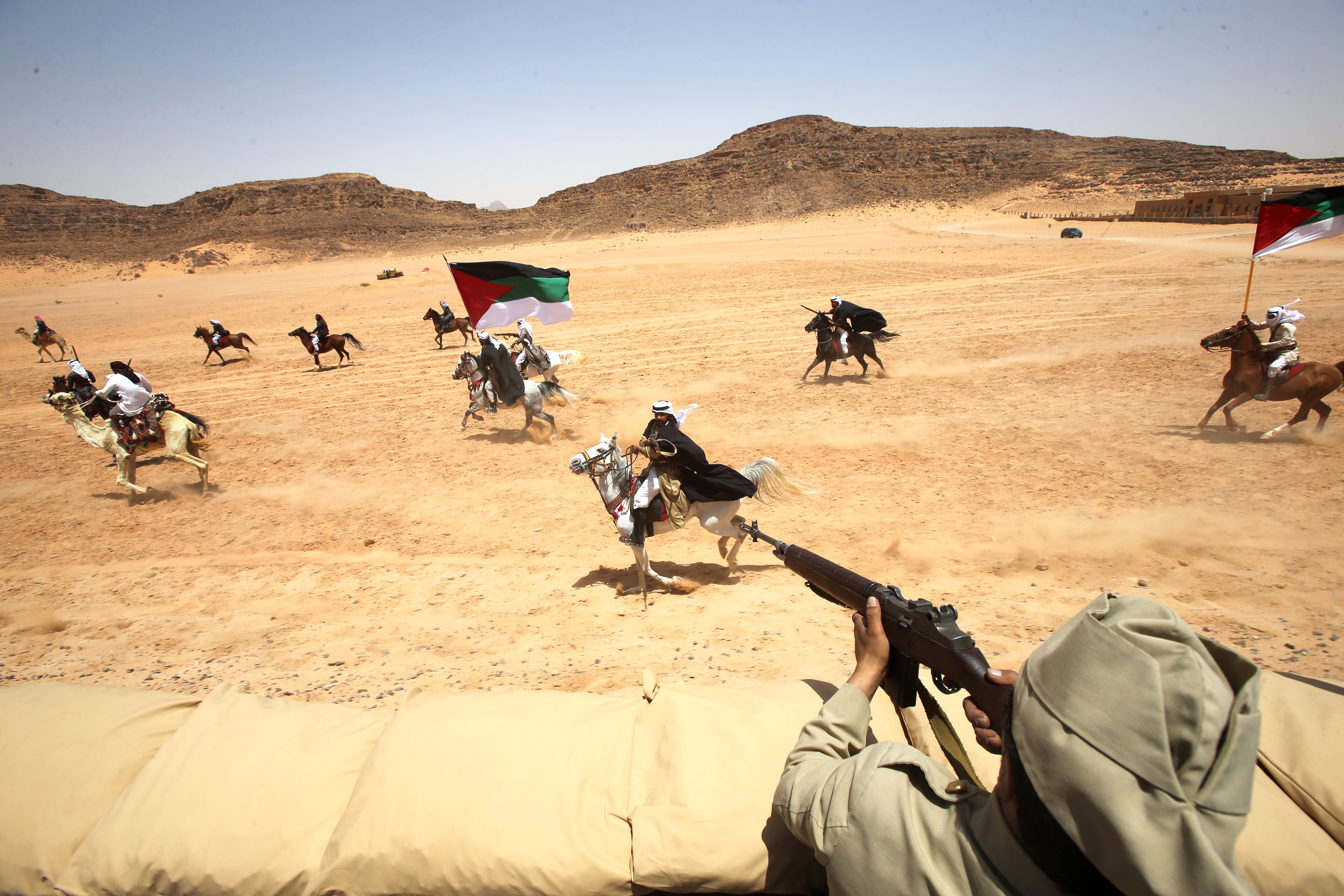 A group of regional bedouin actors in historical military costumes re-enact the events of the “Great Arab Revolt” that broke out in 1916, when this desert witnessed the Bedouin population joining the Arab forces led by King Faisal to fight the Ottoman army between 1916 and 1918, performing on May 06, 2023 in Wadi Rum, Jordan. The Hejaz Railway was built by Ottoman ruler Sultan Abdulhameed in 1909 and destroyed during the Arab Revolution attack against the Ottoman Empire. It became a UNESCO World Heritage Site due to its importance as a route for the yearly Islamic pilgrimage to the Holy city of Makkah. (Photo by Salah Malkawi/Getty Images)