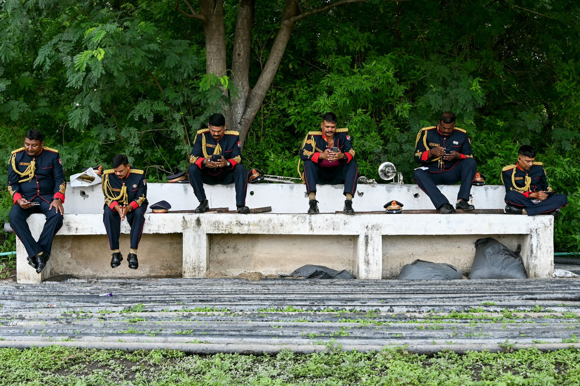 Railway Protection Force (RPF) band personnel rest before the start of a ceremony to mark India's Independence Day in Secunderabad on August 15, 2024. (Photo by Noah Seelam/AFP Photo)