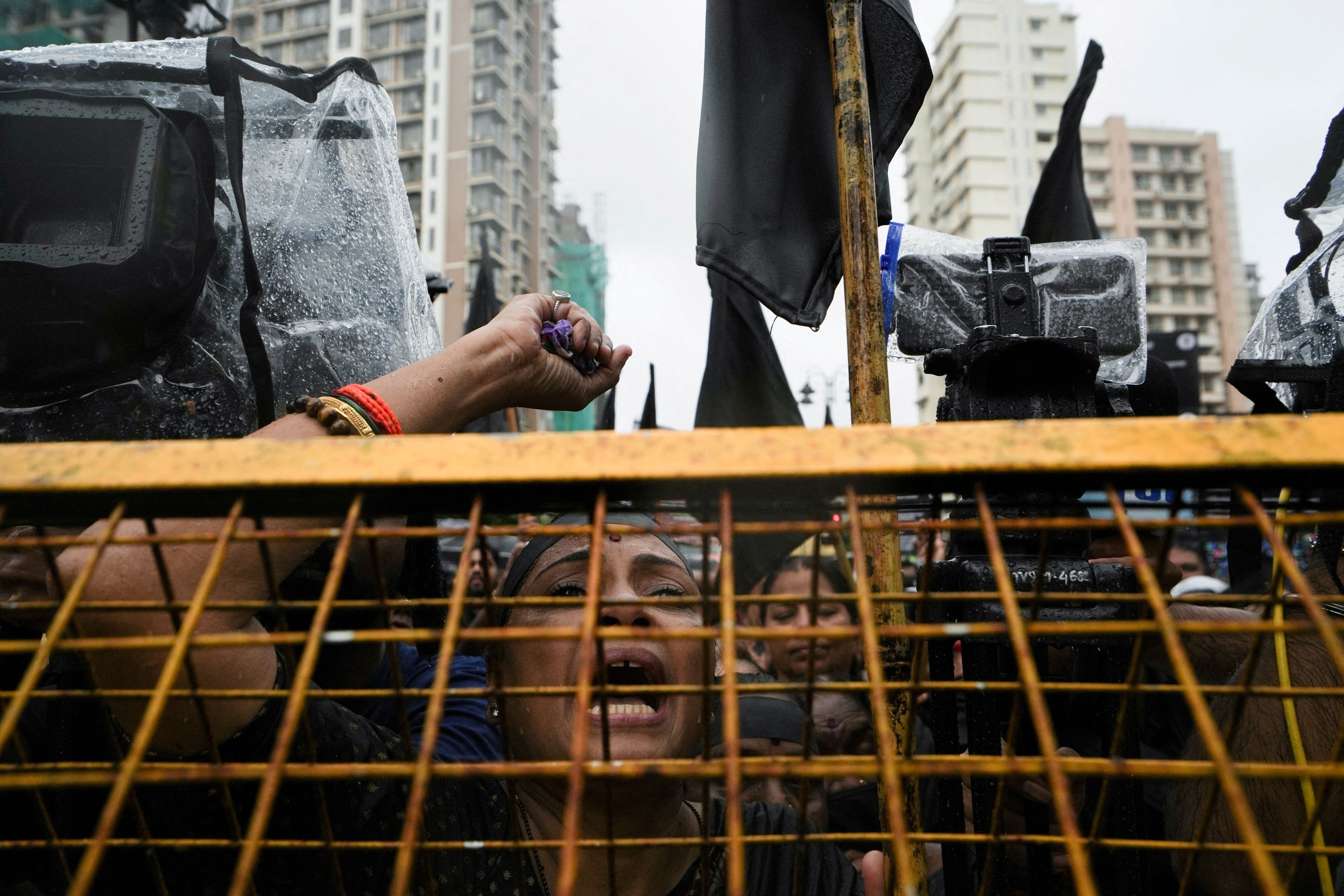 People participate in a silent protest organized by the leaders of Shiv Sena (Uddhav Balasaheb Thackeray), a regional party, condemning the alleged sexual assault of two minor girls in Badlapur school, at Shiv Sena Bhavan in Mumbai, India on August 24, 2024. (Photo by Hemanshi Kamani/Reuters)