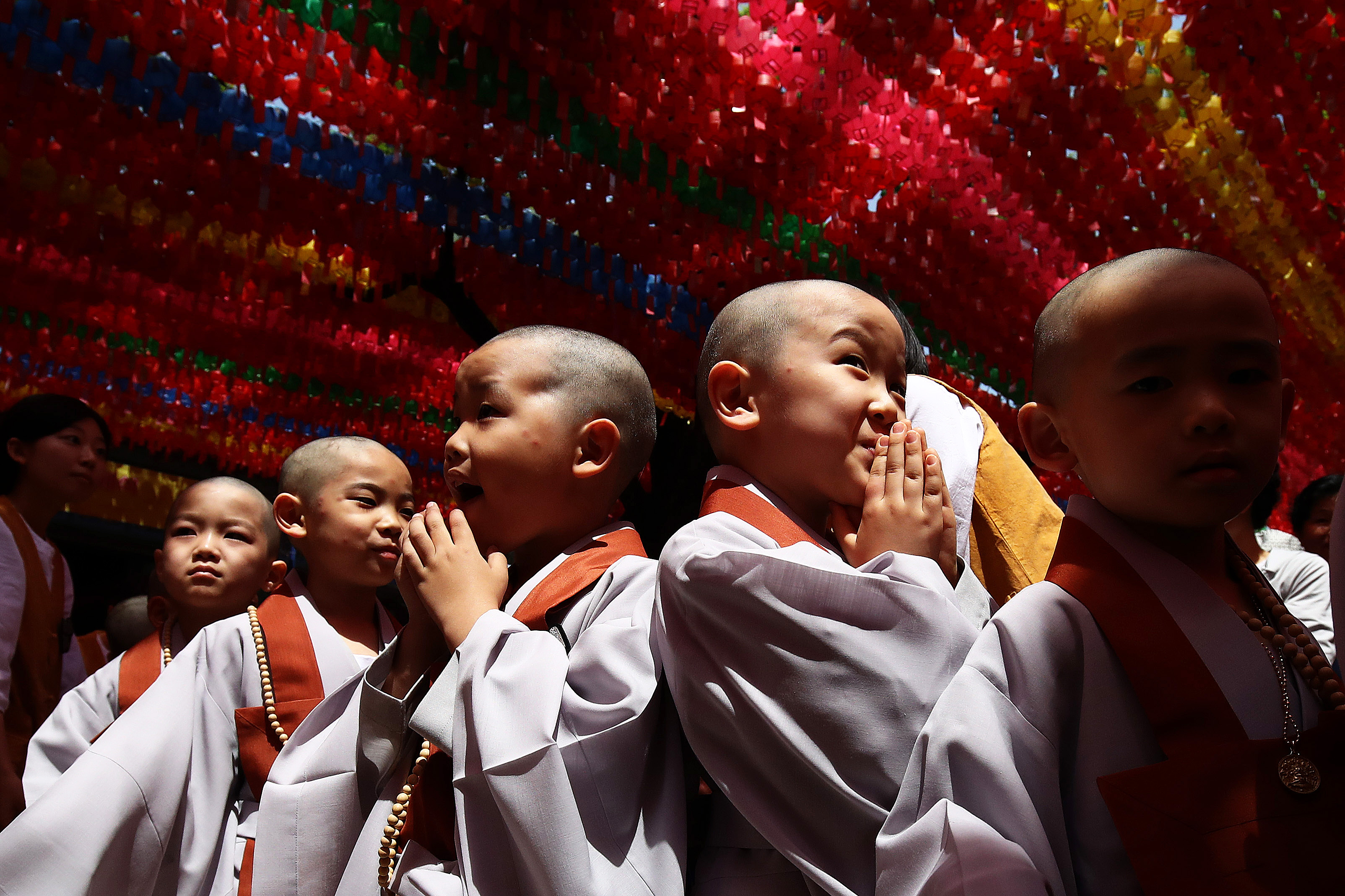 South Korean child monks attend during a ceremony to prepare children to live as Buddhist monks for three weeks at Jogyesa Temple on May 09, 2023 in Seoul, South Korea. As part of the celebration of Buddha's birthday, young children are annually invited to become Buddhist monks for a three-week period. (Photo by Chung Sung-Jun/Getty Images)