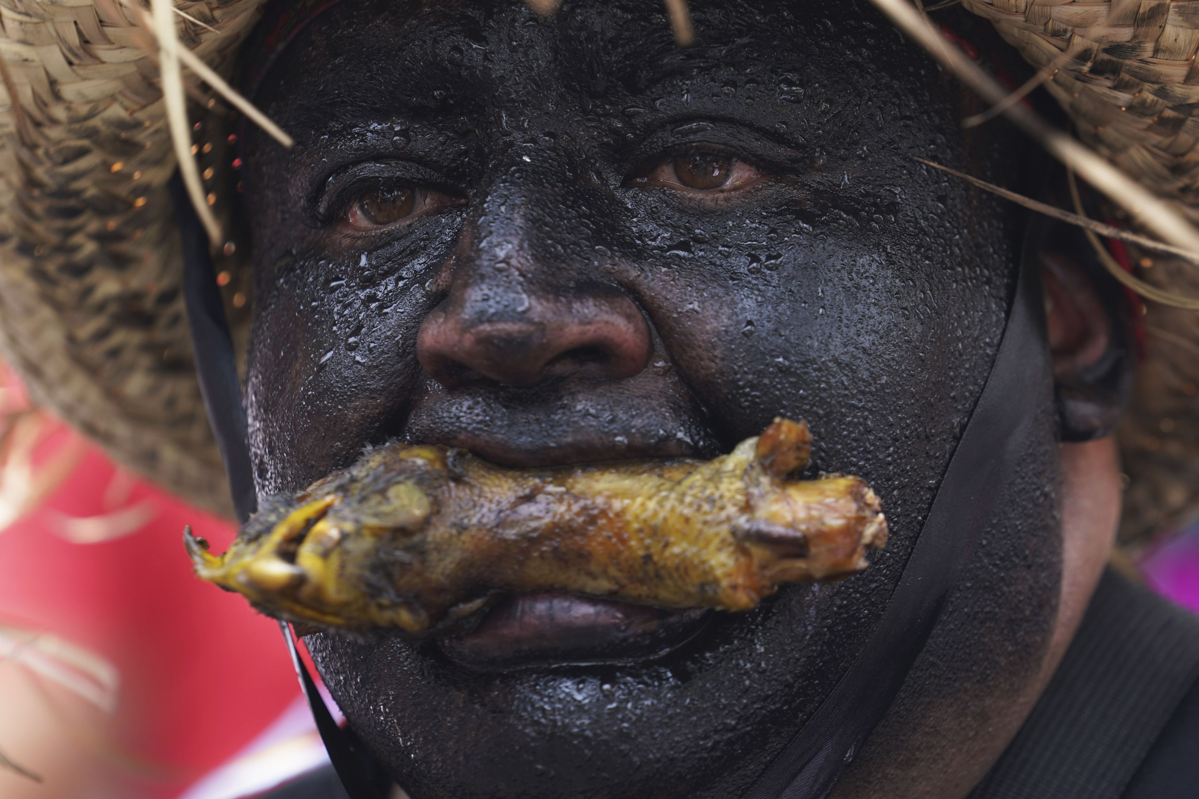 A person taking part in a reenactment of the Battle of Puebla holds a chicken's head in his mouth, during a Cinco de Mayo celebration, in Mexico City, Friday, May 5, 2023. On May 5, 1862, Mexican forces loyal to Benito Juarez defeated French troops sent by Napoleon III in the Battle of Puebla. (Photo by Marco Ugarte/AP Photo)