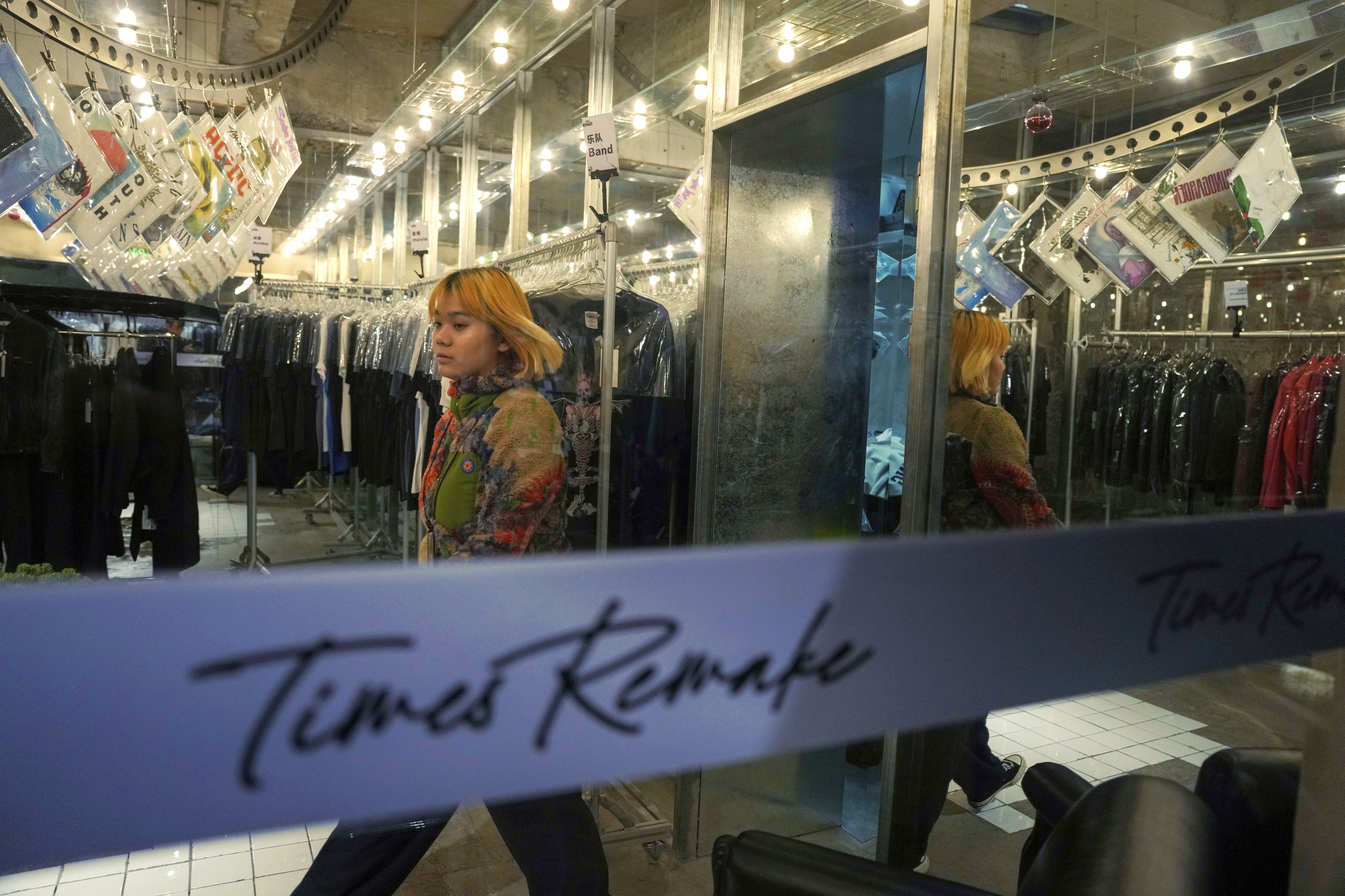 A worker walks around in a store for Times Remake, a Shanghai-based brand that takes secondhand clothes and refashions them into new garments in Shanghai on March 18, 2024. (Photo by Ng Han Guan/AP Photo)