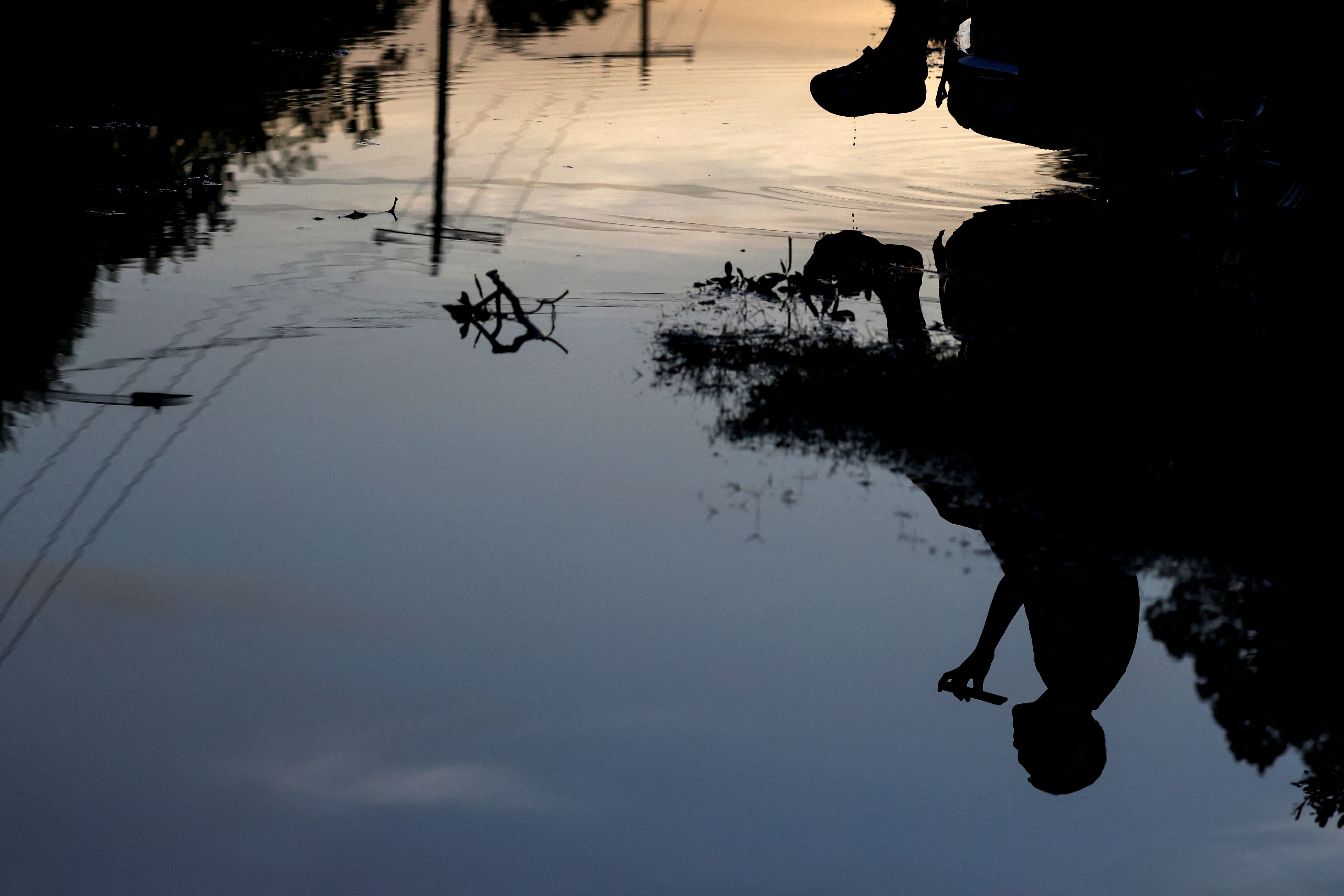 Reflection of a person in floodwaters in the aftermath of Hurricane Beryl, in Houston, Texas on July 8, 2024. (Photo by Daniel Becerril/Reuters)