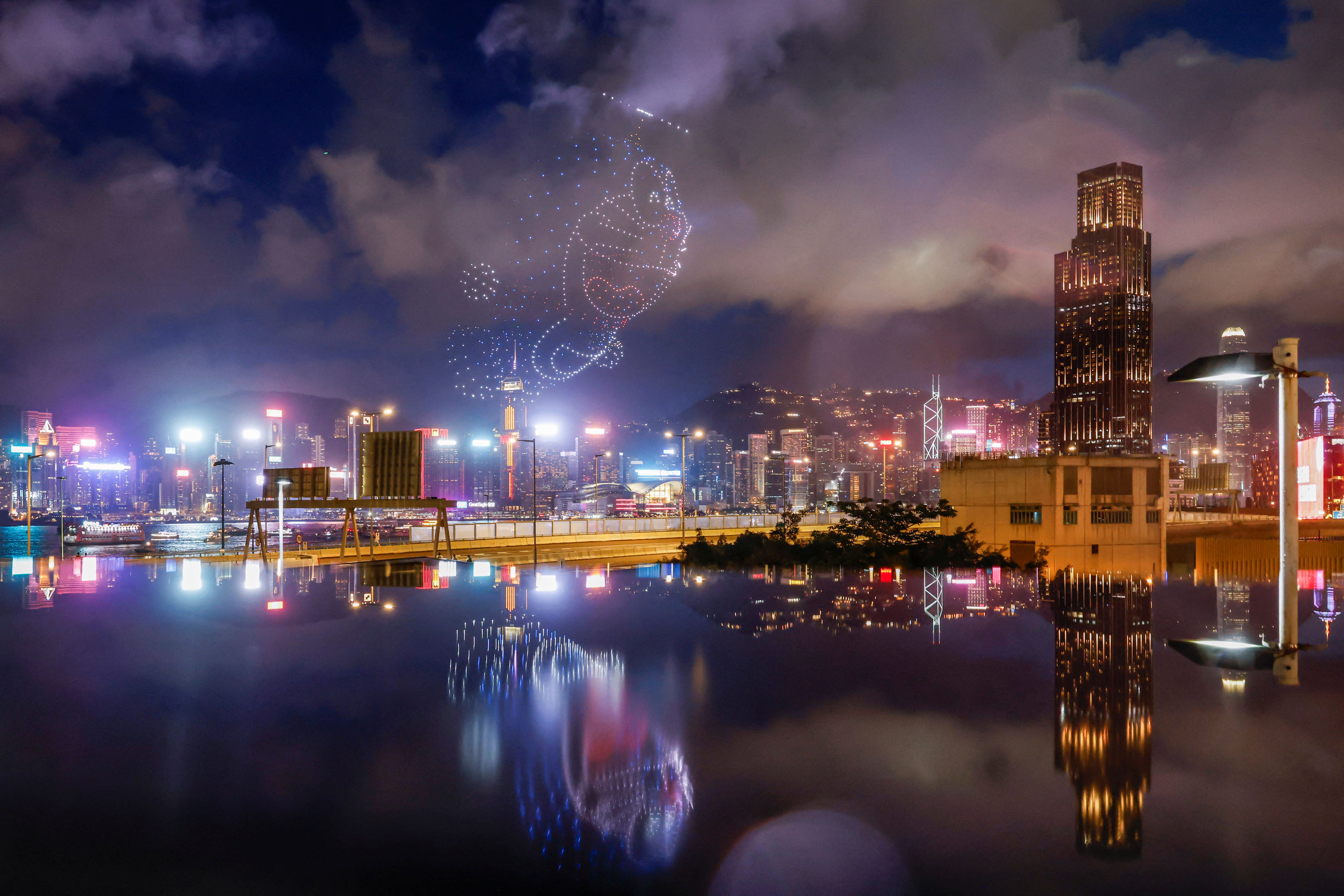 Approximately 1,000 drones illuminate the sky above Victoria Harbour during the Doraemon drone show in Hong Kong on July 20, 2024. (Photo by Tyrone Siu/Reuters)