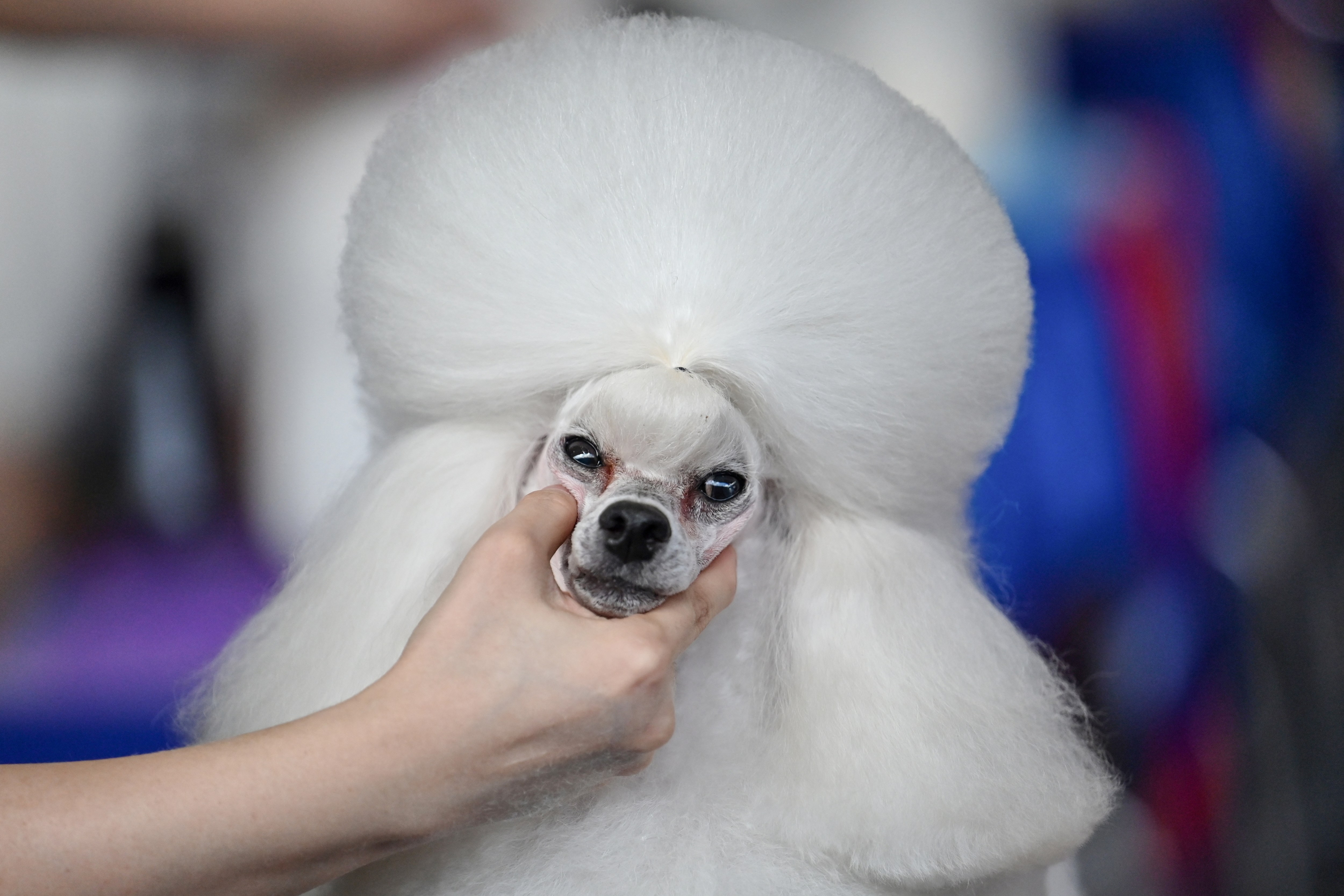A participant holds a dog during a grooming contest at Pet Fair Asia in Shanghai on August 21, 2024. (Photo by Hector Retamal/AFP Photo)