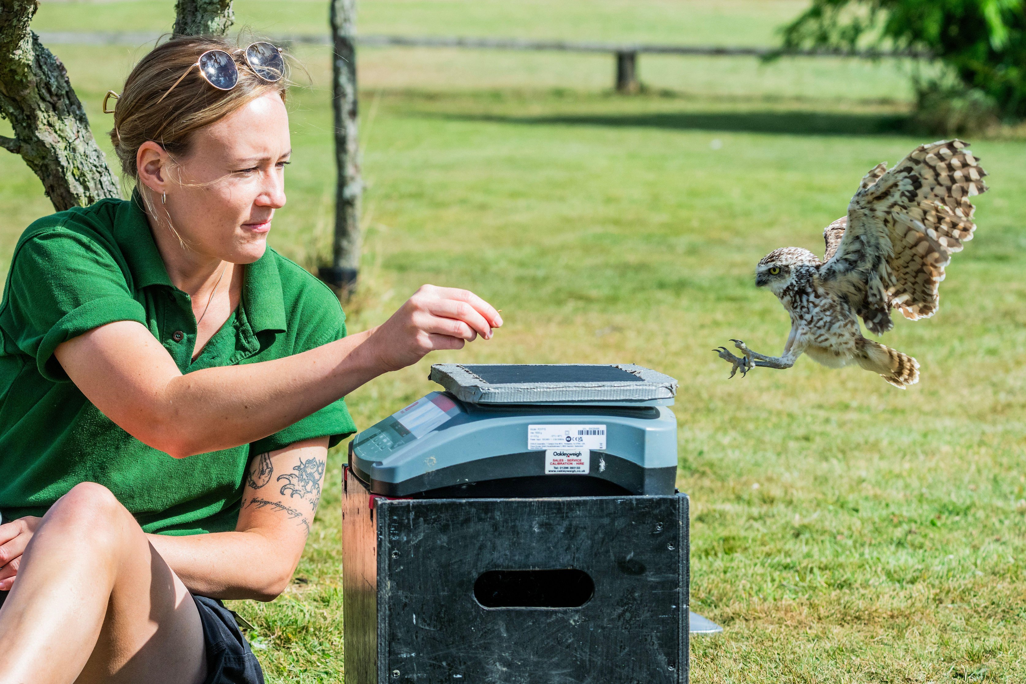 Burrowing Owl Ettie is rewarded with a mealworm by her keeper Anna on August 21, 2024 – Whipsnade Zoo (ZSL) carry out their annual weigh-in. The keepers record the weights and measurements of the animals – information which provides a critical insight into their health and wellbeing. (Photo by Guy Bell/Alamy Live News)