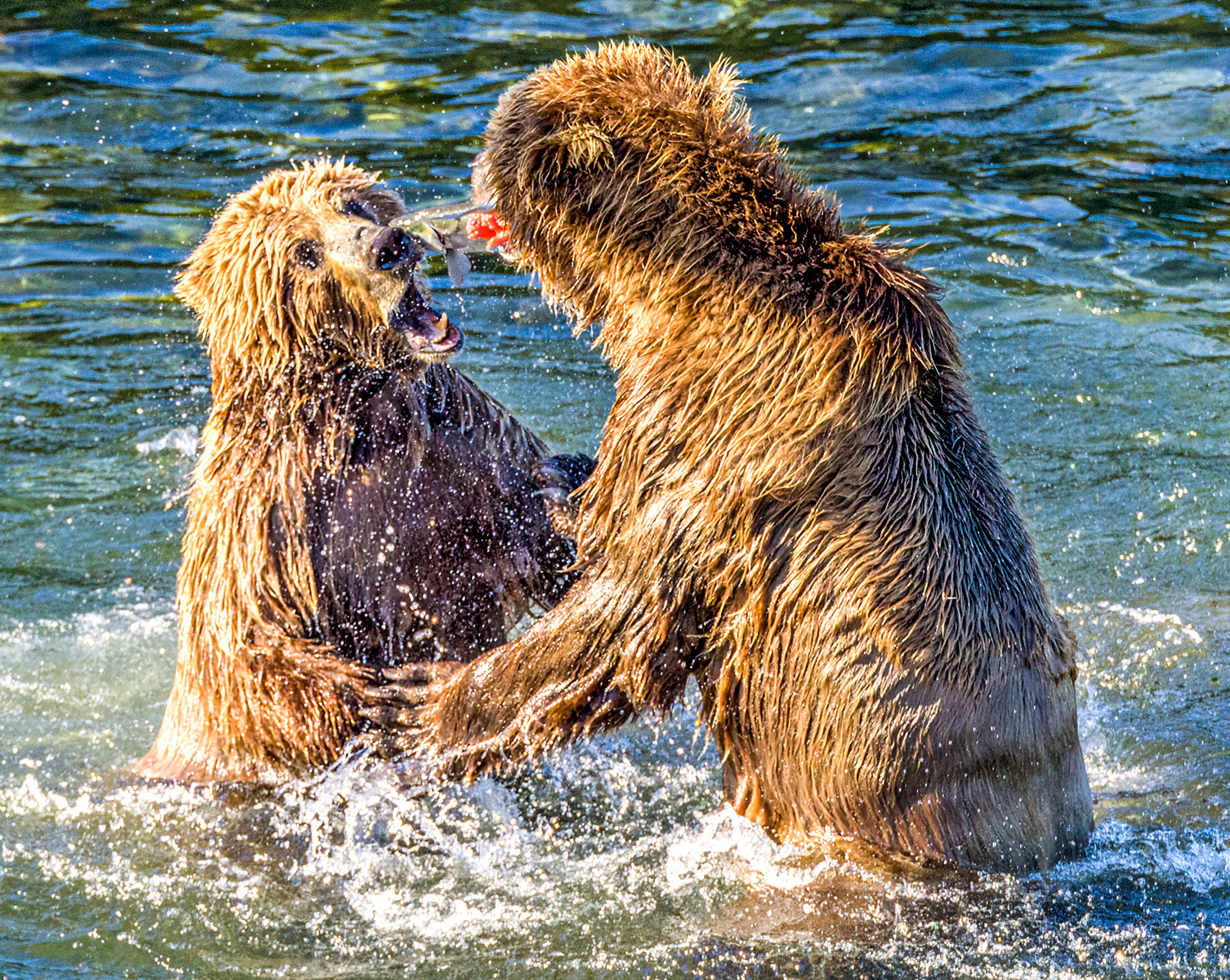 Two mother bears fight over salmon, clawing and punching each other to try and get the fish in Katmai National Park, Alaska in the second decade of August 2024. After all that, neither bear was the victor and some nearby seagulls were the lucky recipients instead. (Photo by Rich Brooks/Solent News)