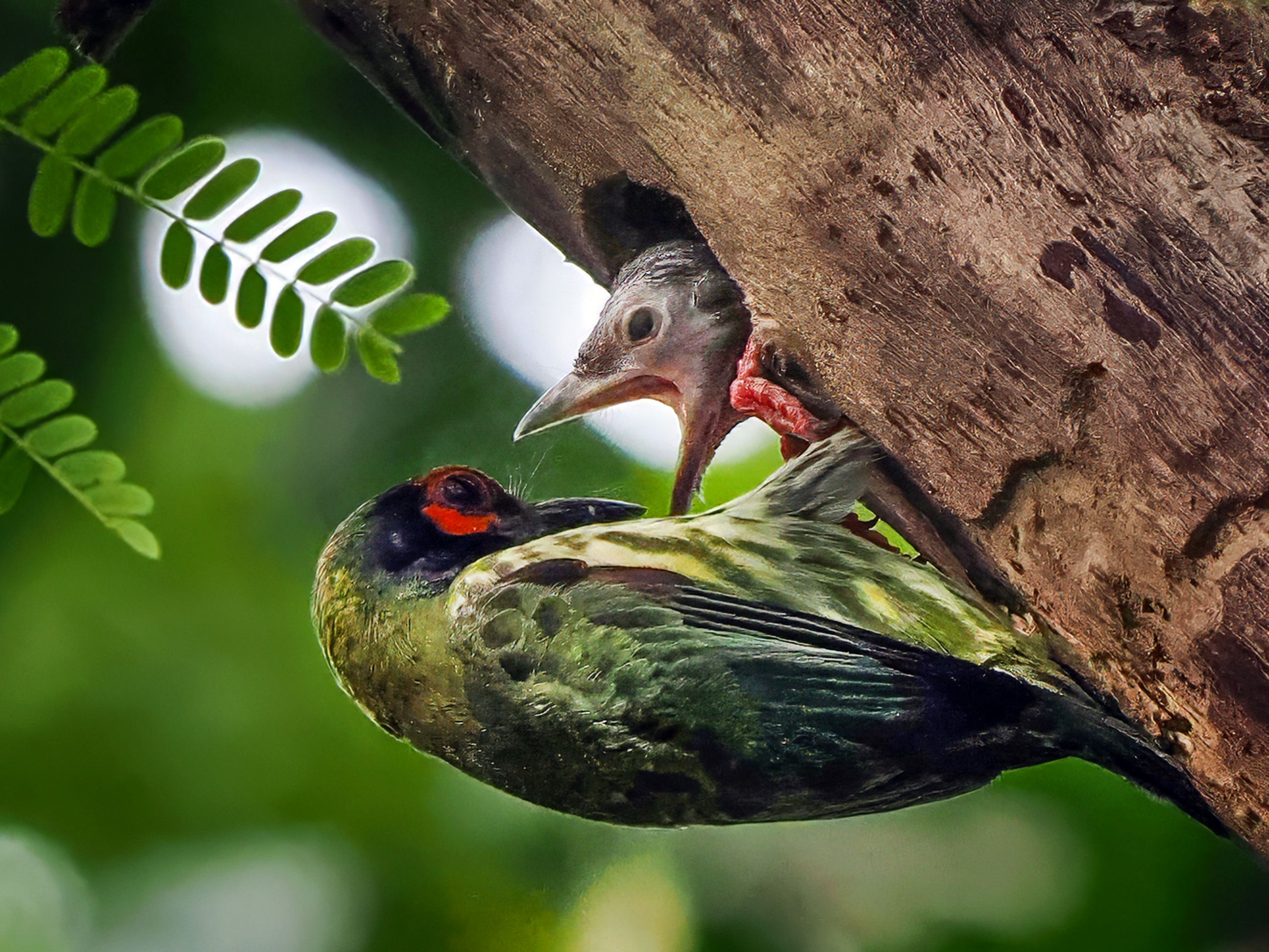 A coppersmith barbet feeds its chick near Prambanan Temple, Indonesia in the second decade of August 2024. These birds are named for their metronomic call that sounds similar to a copper sheet being beaten. (Photo by Dzul Dzulfikri/Media Drum Images)
