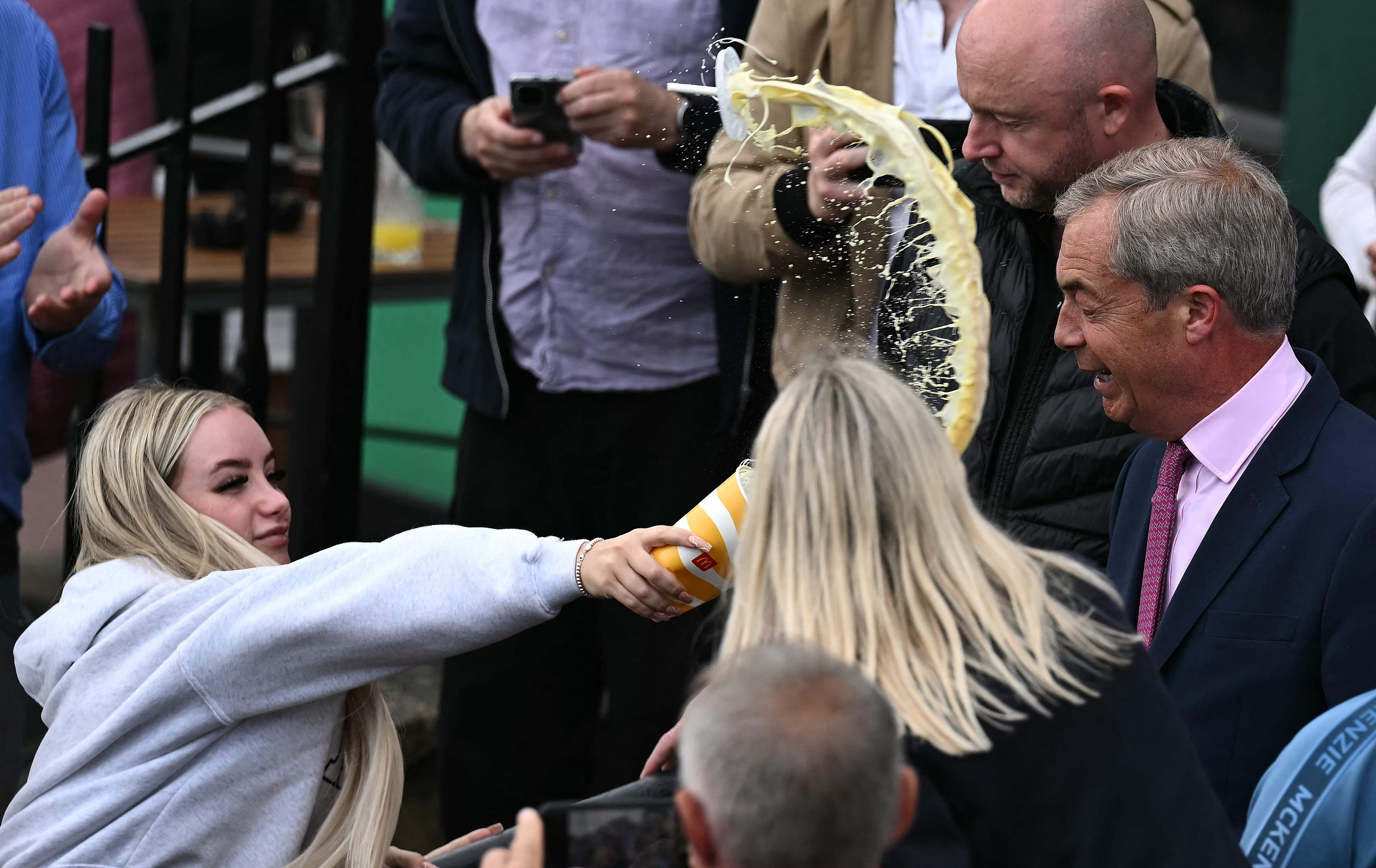 A person throws the contents of a drinks cup in the face of newly appointed leader of Britain's right-wing populist party, Reform UK, and the party's parliamentary candidate for Clacton, Nigel Farage, during his general election campaign launch in Clacton-on-Sea, eastern England, on June 4, 2024. Nigel Farage on Monday said he would stand as a candidate for the anti-immigration Reform UK party in Britain's general election next month, after initially ruling out running. “I have changed my mind... I am going to stand”, Farage, 60, told a news conference. He will seek election on July 4 in the fiercely pro-Brexit seat of Clacton, southeast England. (Photo by Ben Stansall/AFP Photo)