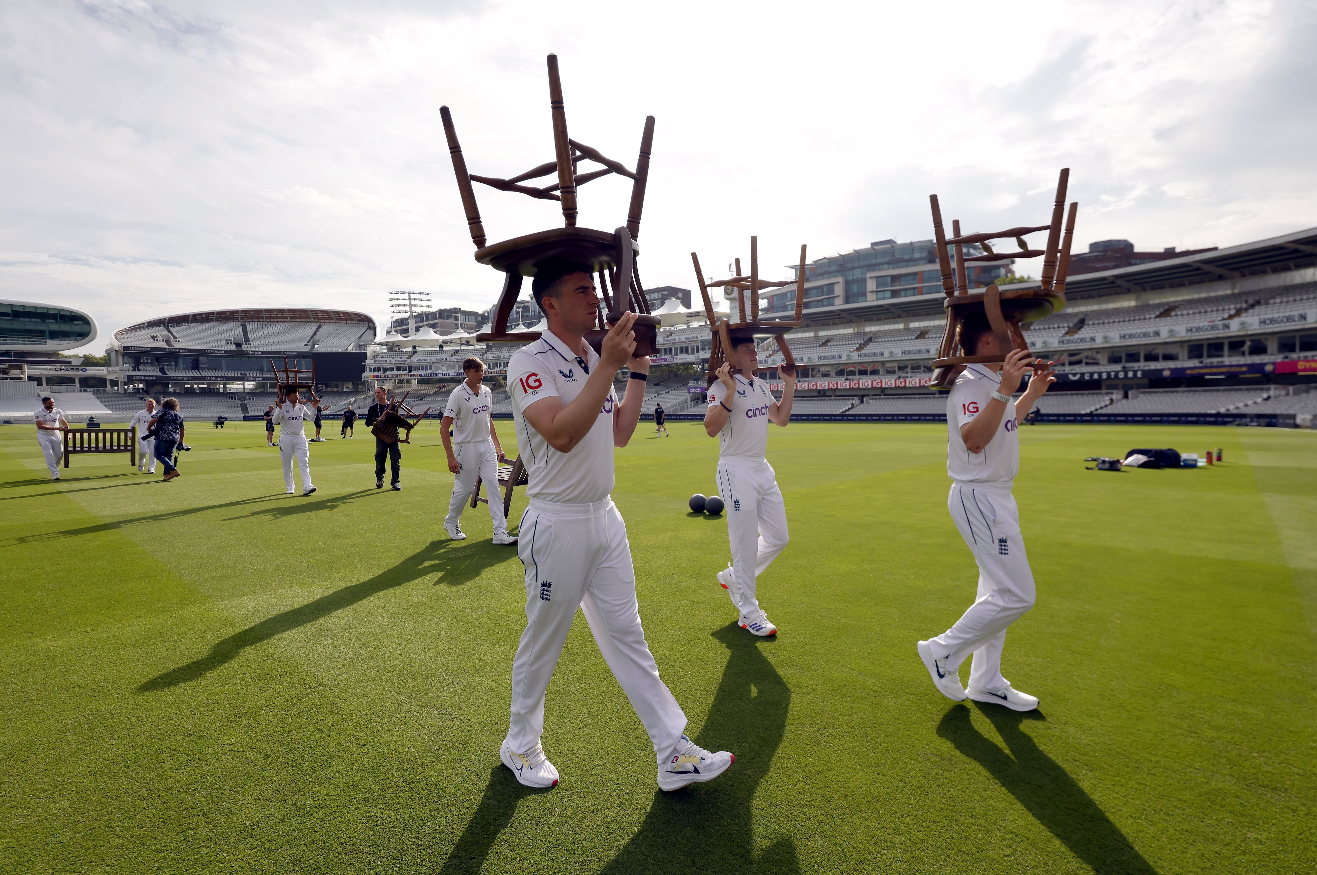 England's Dan Lawrence and Matthew Potts (centre) ahead of a nets session at Lord's, London on Wednesday, August 28, 2024. (Photo by Steven Paston/PA Wire Press Association)