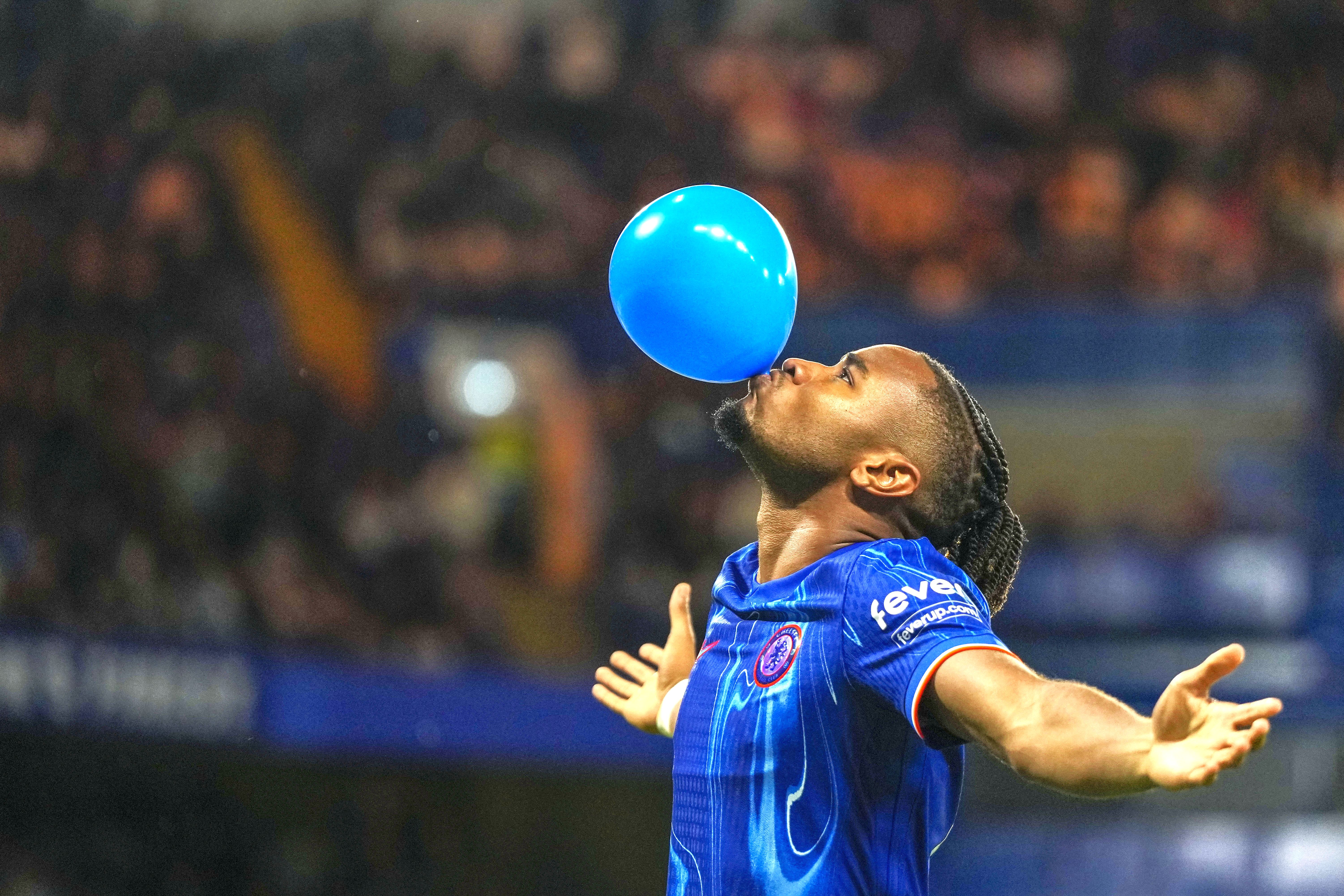 Chelsea's Christopher Nkunku celebrates after scoring his side's opening goal from a penalty spot during the Europa Conference League play-off first leg soccer match between Chelsea and Servette, at Stamford Bridge stadium in London, Thursday, August 22, 2024. (Photo by Alastair Grant/AP Photo)