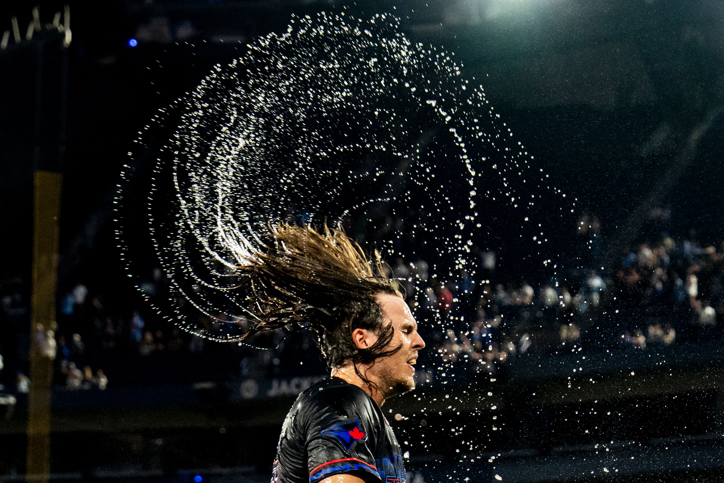 Addison Barger #47 of the Toronto Blue Jays shakes off water after defeating the Los Angeles Angels at Rogers Centre on August 23, 2024 in Toronto, Canada. (Photo by Kevin Sousa/Getty Images/AFP Photo)