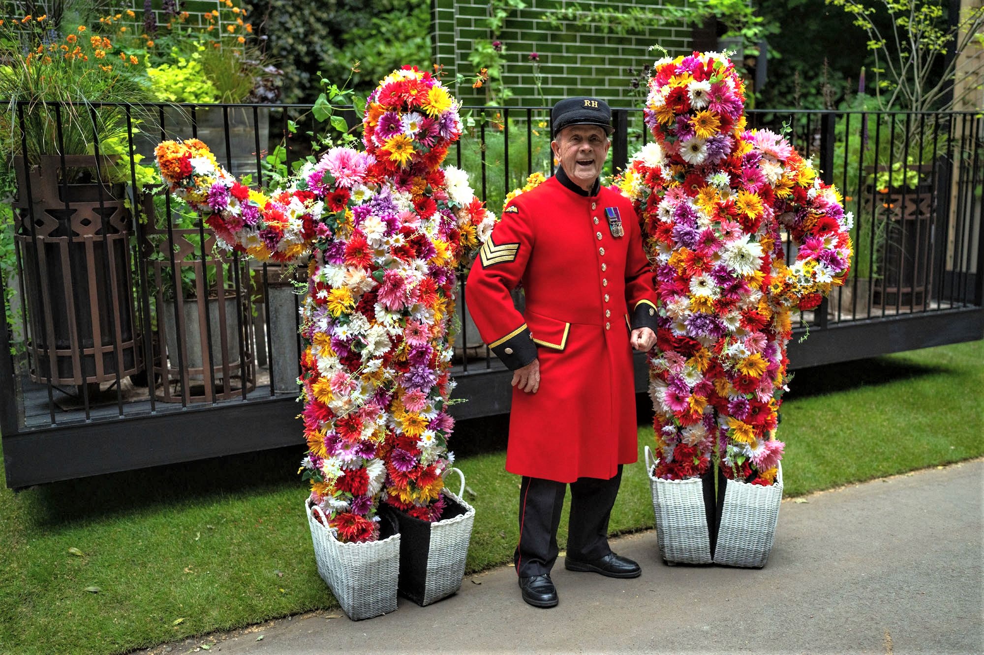 A “Chelsea pensioner” poses for a photograph with the “Bush Boys” at the Chelsea Flower Show on May 22, 2023 in London, England. The Chelsea Flower Show, also known as the Great Spring Show, is held for five days in May by the Royal Horticultural Society on the grounds of the Royal Hospital Chelsea. (Photo by Carl Court/Getty Images)