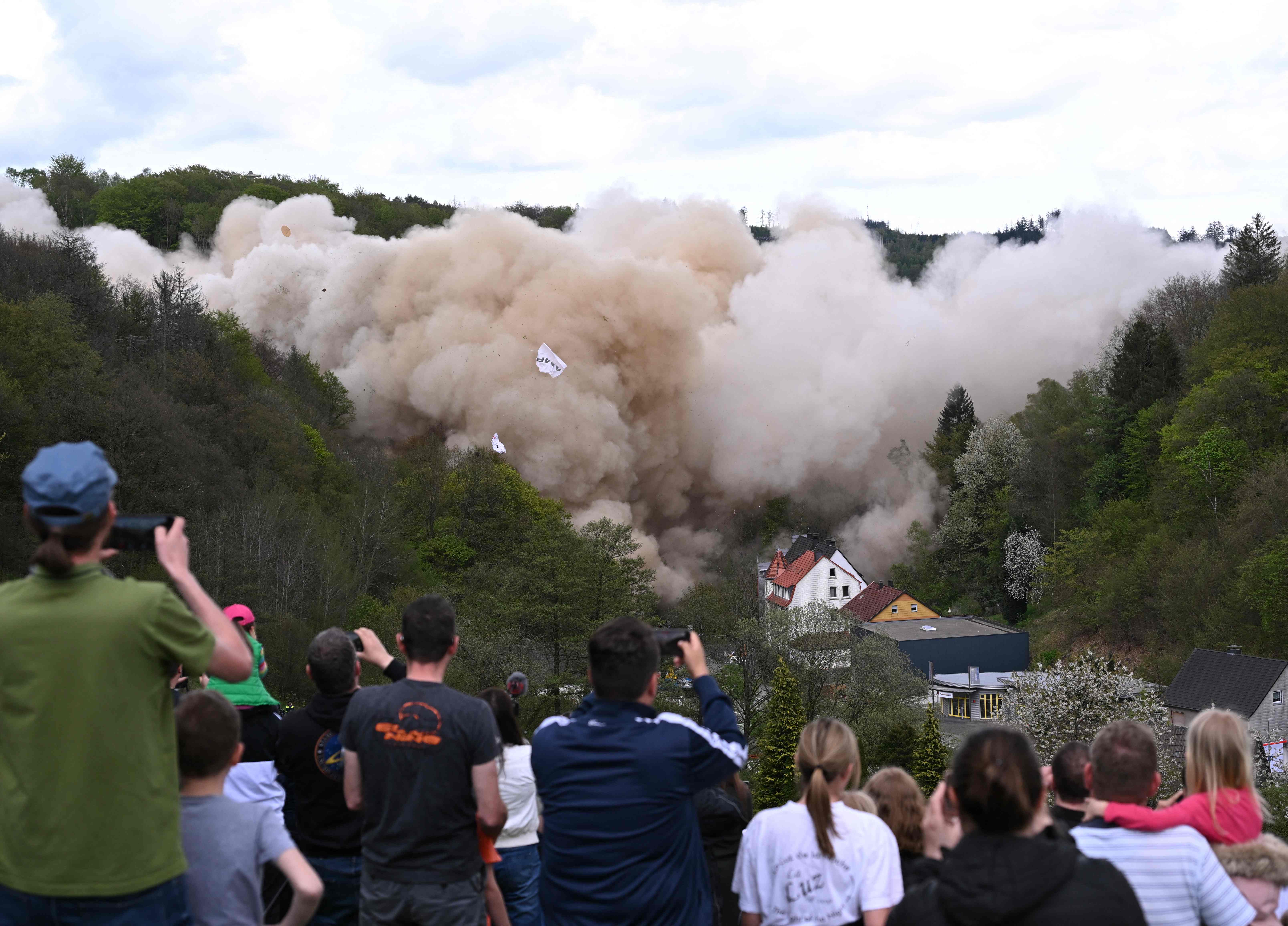 People take pictures of the Rahmede highway bridge during its blasting on May 7, 2023 on the A45 motorway, near Luedenscheid, western Germany. During a routine inspection of the 453-metre-long Rahmede viaduct in December 2021, inspectors discovered deformations in the steel wall that could affect the bridge's load-bearing capacity. According to the motorway company, a new construction will take at least five years. (Photo by Ina Fassbender/AFP Photo)