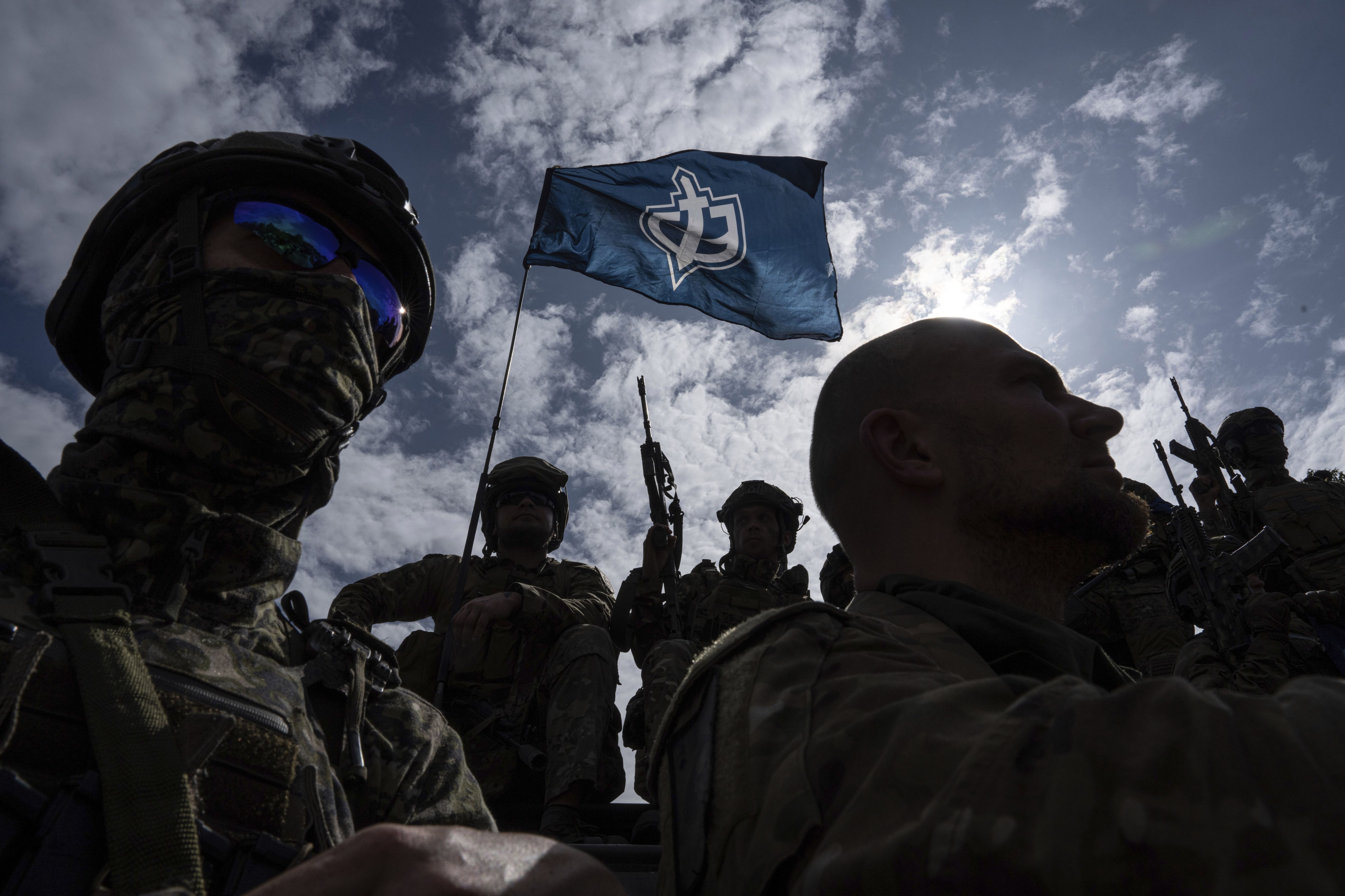 Fighters of Russian Volunteer Corps stand atop on an APC during press conference not far from the border in Sumy region, Ukraine, Wednesday, May 24, 2023. Russia's military said Tuesday it quashed what appeared to be one of the most serious cross-border attacks from Ukraine since the war began, claiming to have killed more than 70 attackers in a battle that lasted around 24 hours. (Photo by Evgeniy Maloletka/AP Photo)