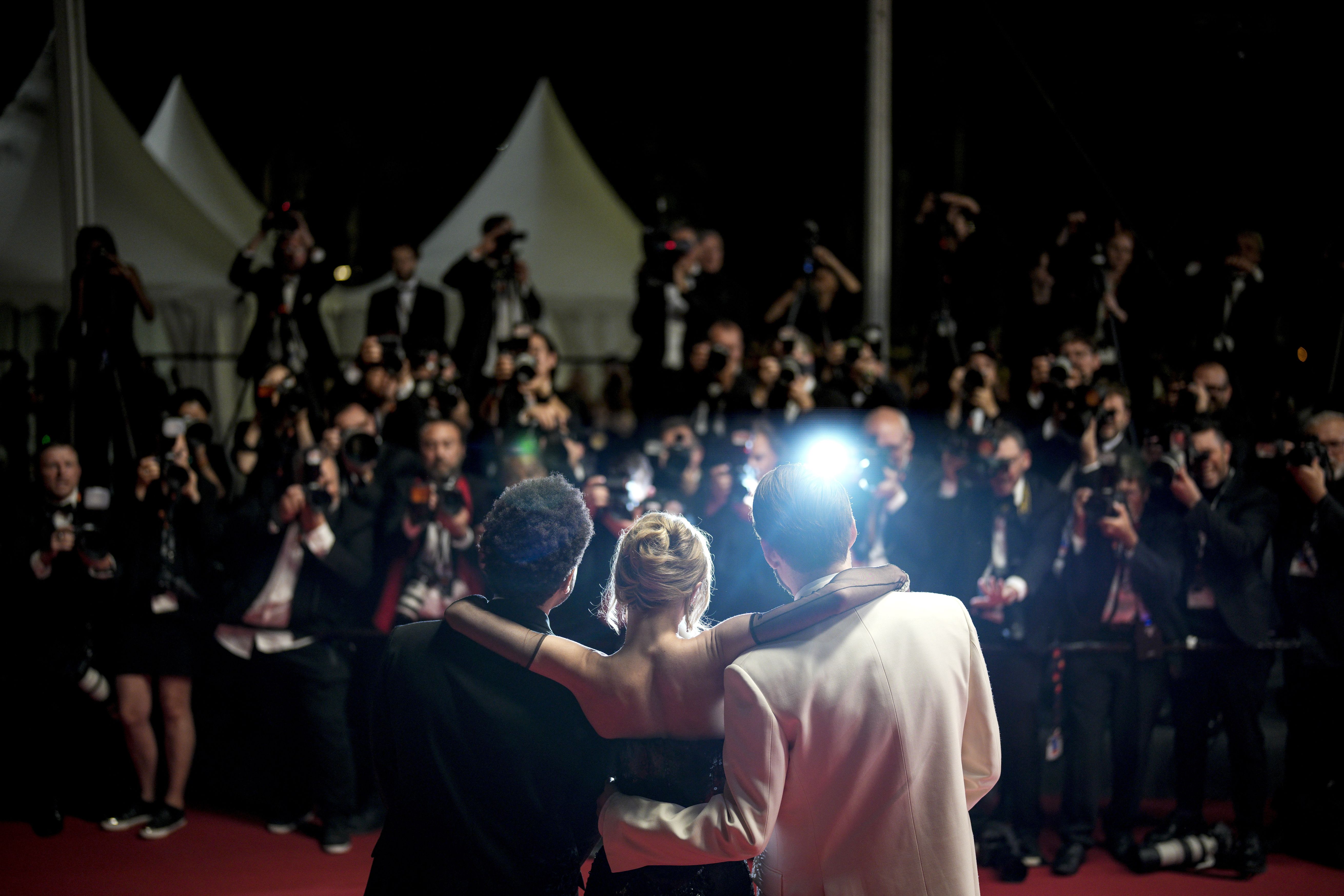 (From L) Canadian singer Abel Makkonen Tesfaye aka The Weeknd, French-US actress Lily-Rose Depp and US director Sam Levinson arrive for the screening of the film “The Idol” during the 76th edition of the Cannes Film Festival in Cannes, southern France, on May 22, 2023. (Photo by Daniel Cole/AP Photo)