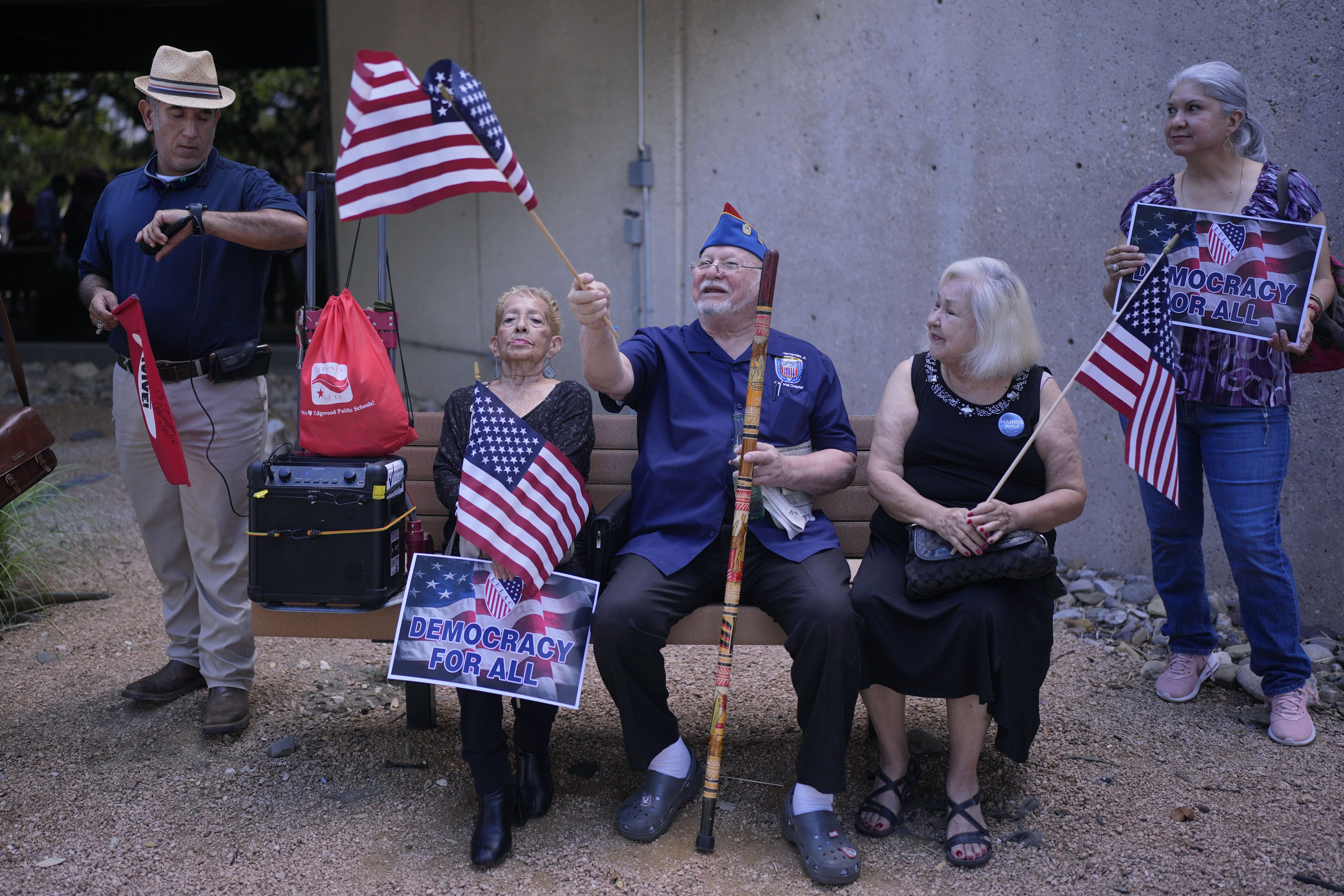 Roman Rena waves a flag where the League of United Latin American Citizens’ officials held a news conference to respond to allegations of voter fraud by the state’s attorney general, in San Antonio, Texas, August 26, 2024. (Photo by Eric Gay/AP Photo)