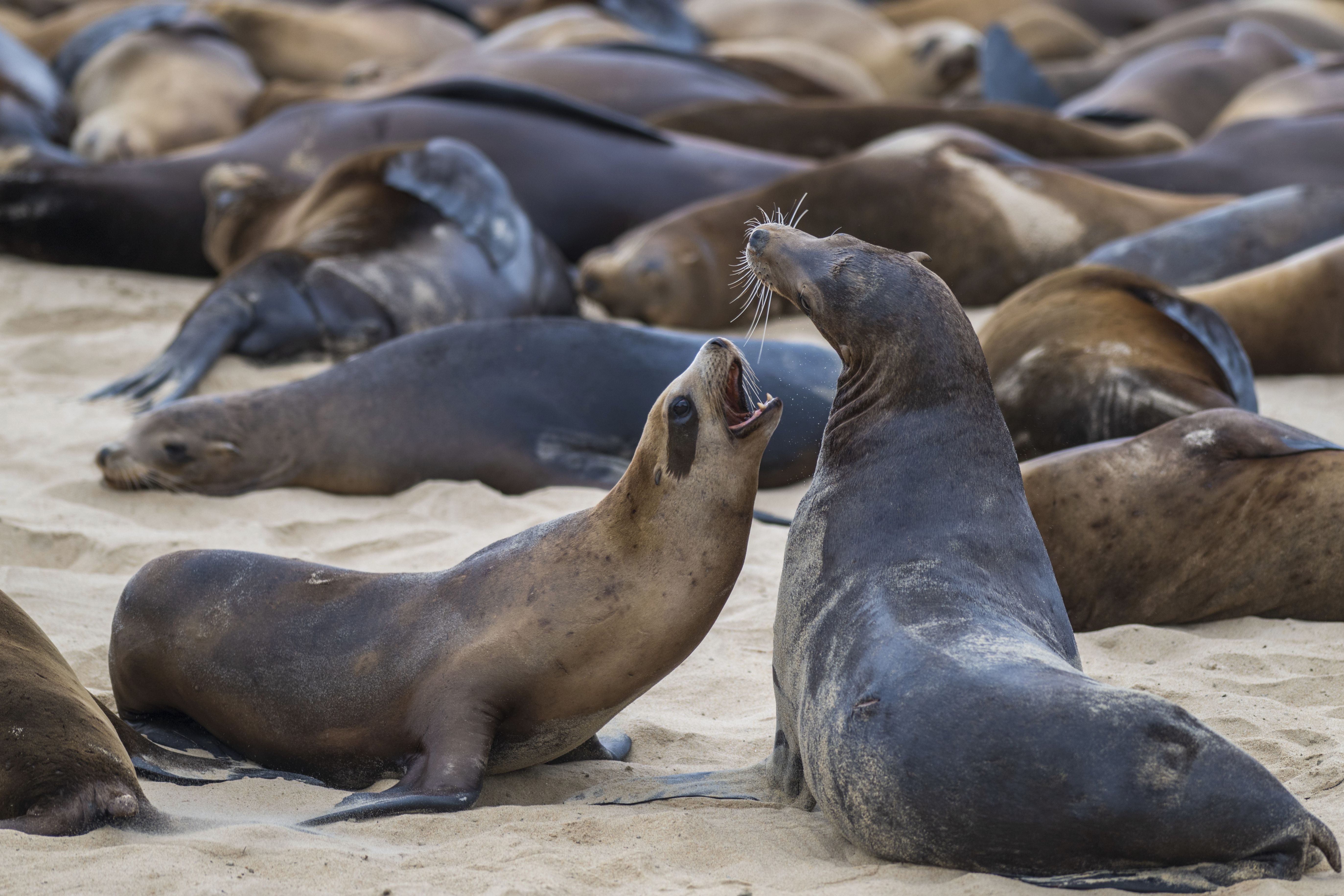 Sea lions play together on San Carlos beach in Monterey, Calif., Friday, August 23, 2024. (Photo by Nic Coury/AP Photo)