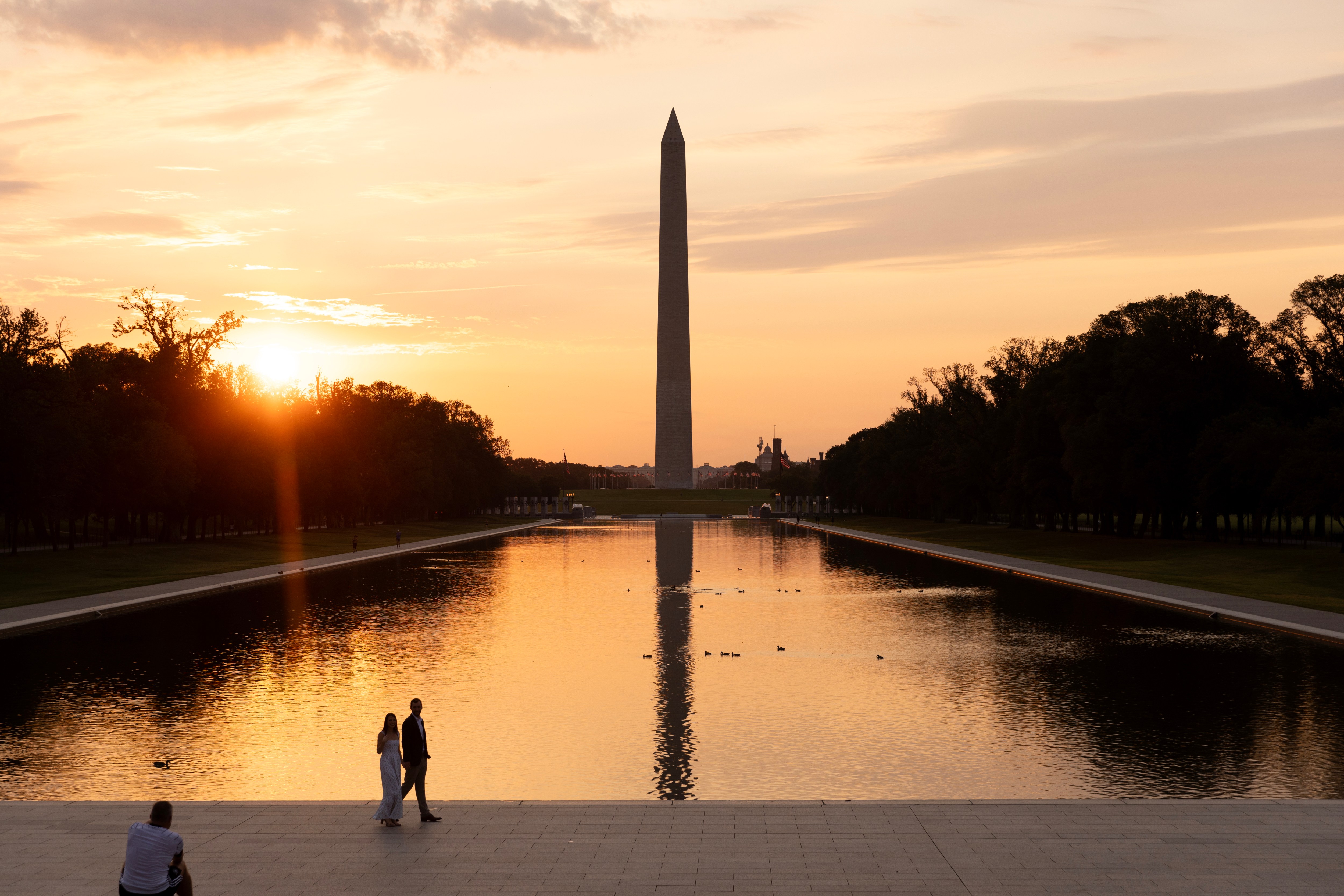 The Washington Monument is reflected in the Lincoln Memorial Reflecting Pool on the National Mall, at dawn in Washington, DC, USA, 29 August 2024. A brief record-setting heat wave in the capital of the United States brought temperatures on 28 August into triple digits. A cold front is expected to provide relief from the heat on 29 August. (Photo by Michael Reynolds/EPA/EFE)