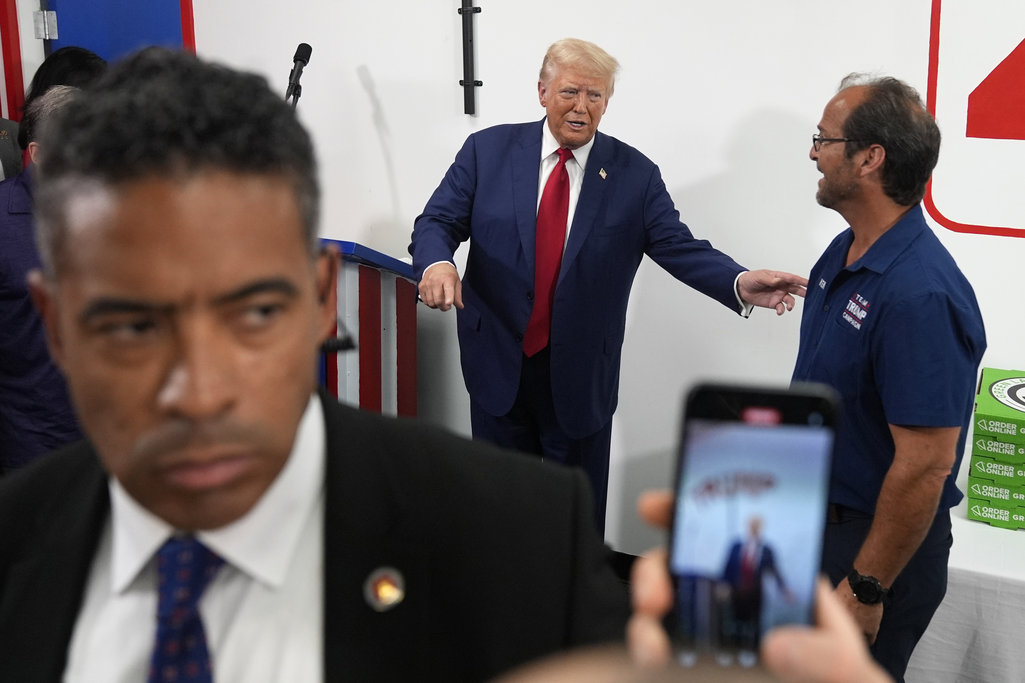 Republican presidential nominee former President Donald Trump, center, speaks with a supporter during a stop at a campaign office, Monday, August 26, 2024, in Roseville, Mich. (Photo by Carolyn Kaster/AP Photo)