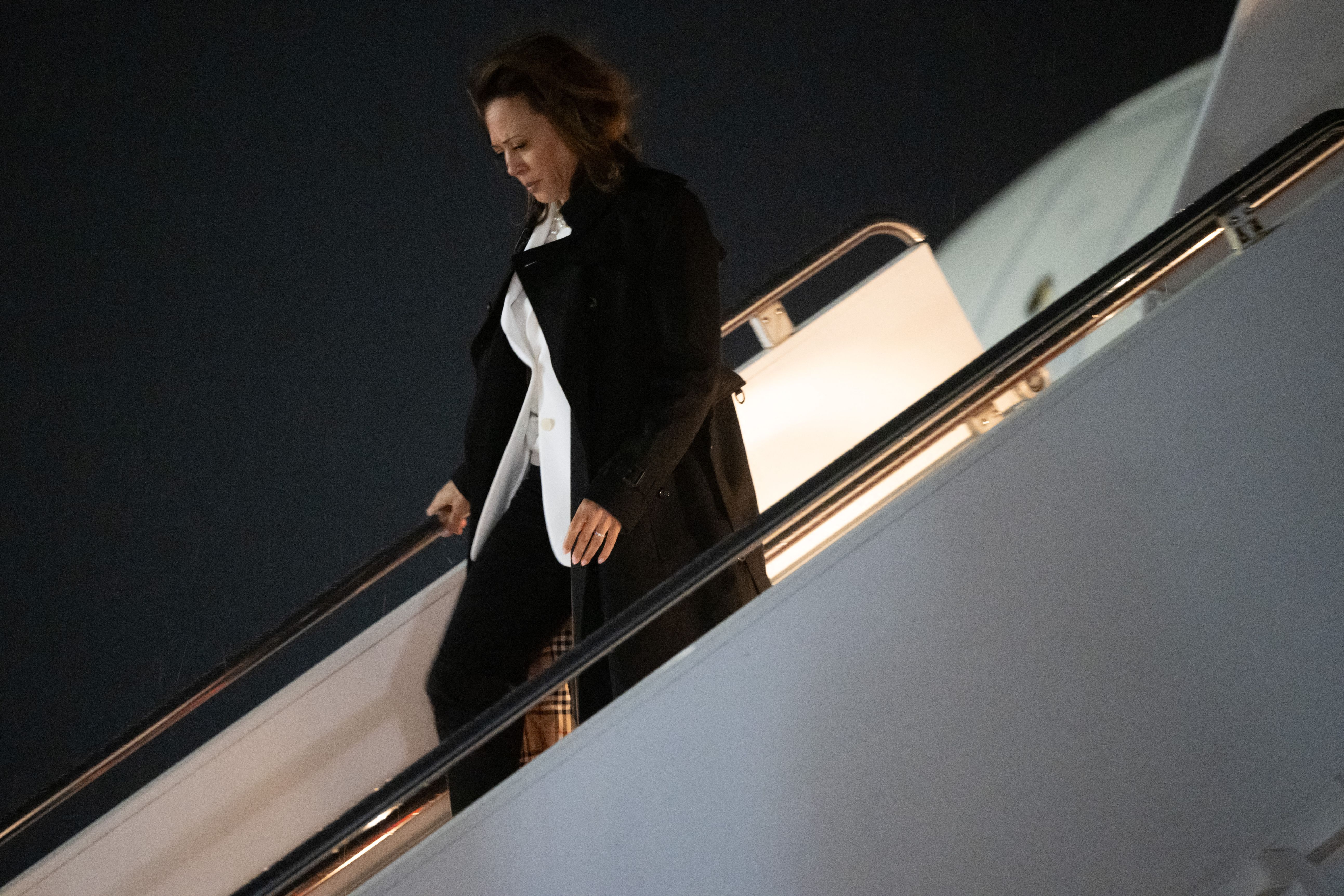 US Vice President and Democratic presidential candidate Kamala Harris isembarks from Air Force Two upon arrival at Joint Base Andrews in Maryland on August 29, 2024. Harris returned to Washington, DC, after her Georgia bus tour. (Photo by Saul Loeb/Pool via AFP Photo)