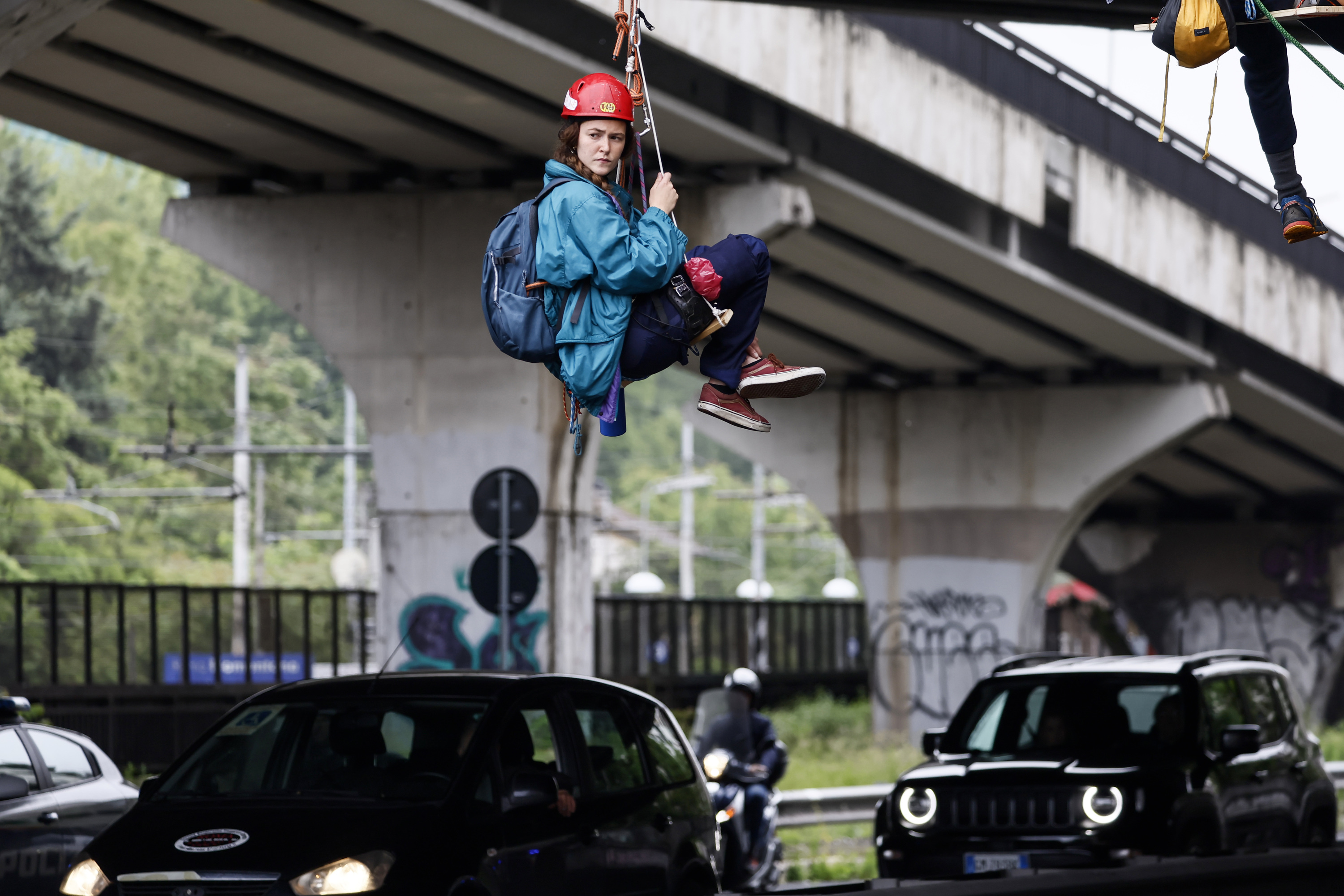 Environmental activists from Ultima Generazione block the city’s ring road during a protest in Rome, Italy on May 17, 2023. (Photo by Cecilia Fabiano/LaPresse/Rex Features/Shutterstock)