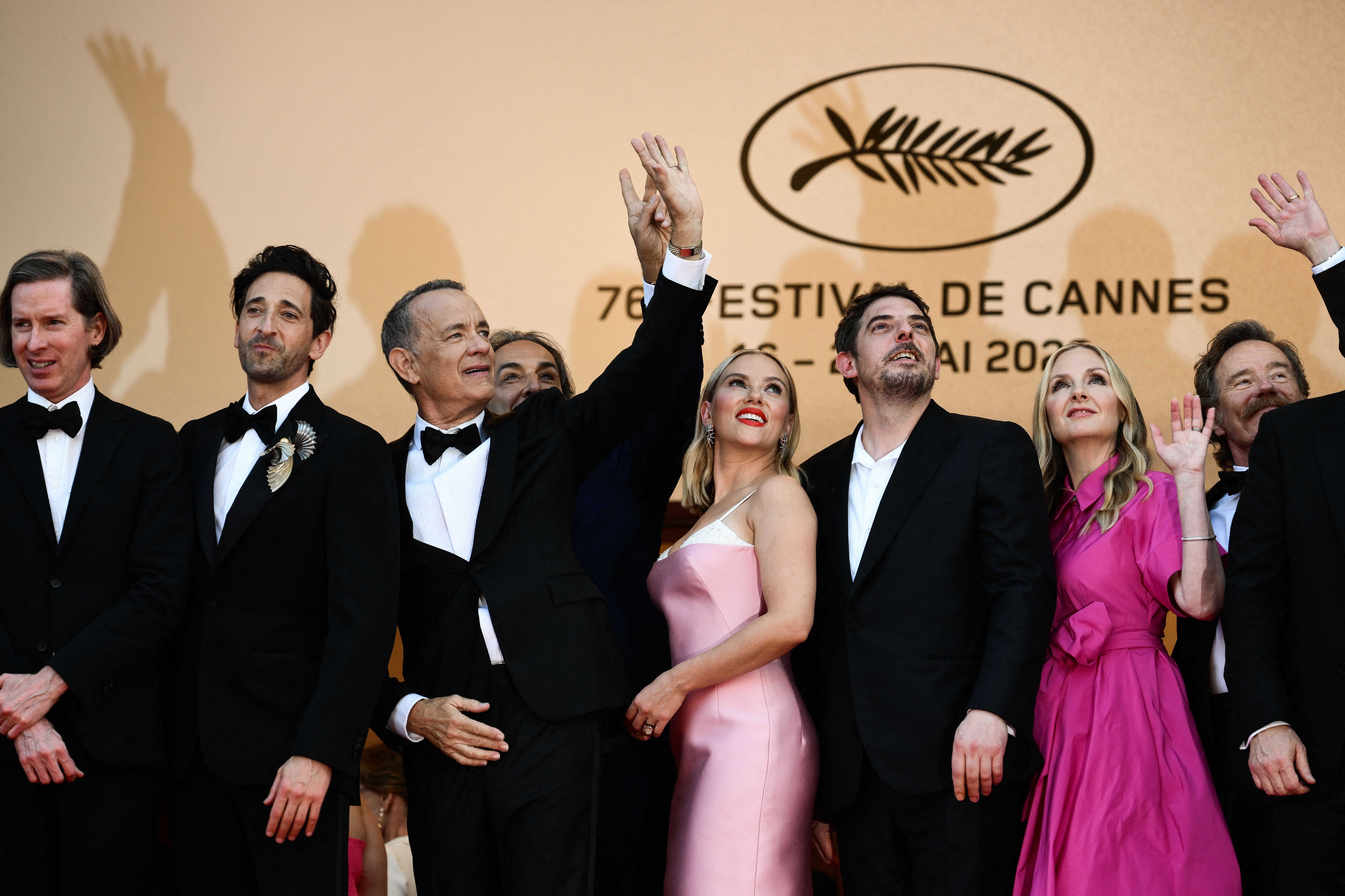 (From L) US producer Wes Anderson, US actor Adrien Brody, us actor Tom Hanks, French music composer Alexandre Desplat, US actress Scarlett Johansson, French actor Damien Bonnard, US actress Hope Davis and US actor Bryan Cranston arrive for the screening of the film “Asteroid City” during the 76th edition of the Cannes Film Festival in Cannes, southern France, on May 23, 2023. (Photo by Christophe Simon/AFP Photo)