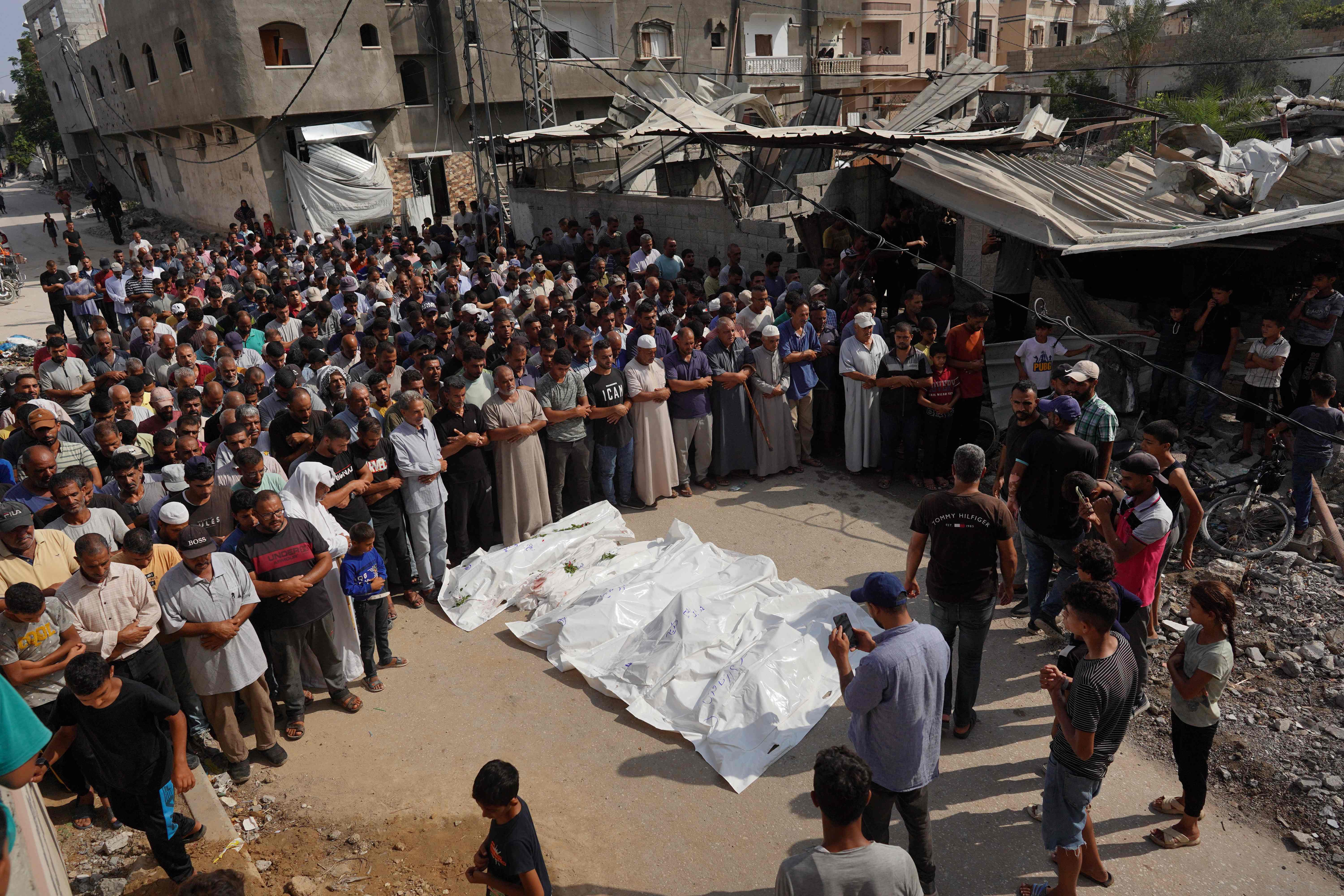 Mourners recite a prayer over the bodies of members of the Qadih family, before their burial in Khuzaa in the southern Gaza Strip, following an overnight Israeli strike that hit their house in Bani Suheila, reportedly killing two children, their father, uncle, paternal grandparents and severely injuring their mother, on July 21, 2024. Dozens have been killed since July 20 across Gaza, the civil defence agency said, including in strikes on homes in the central Nuseirat and Bureij areas and displaced people near southern Khan Yunis. (Photo by Bashar Taleb/AFP Photo)