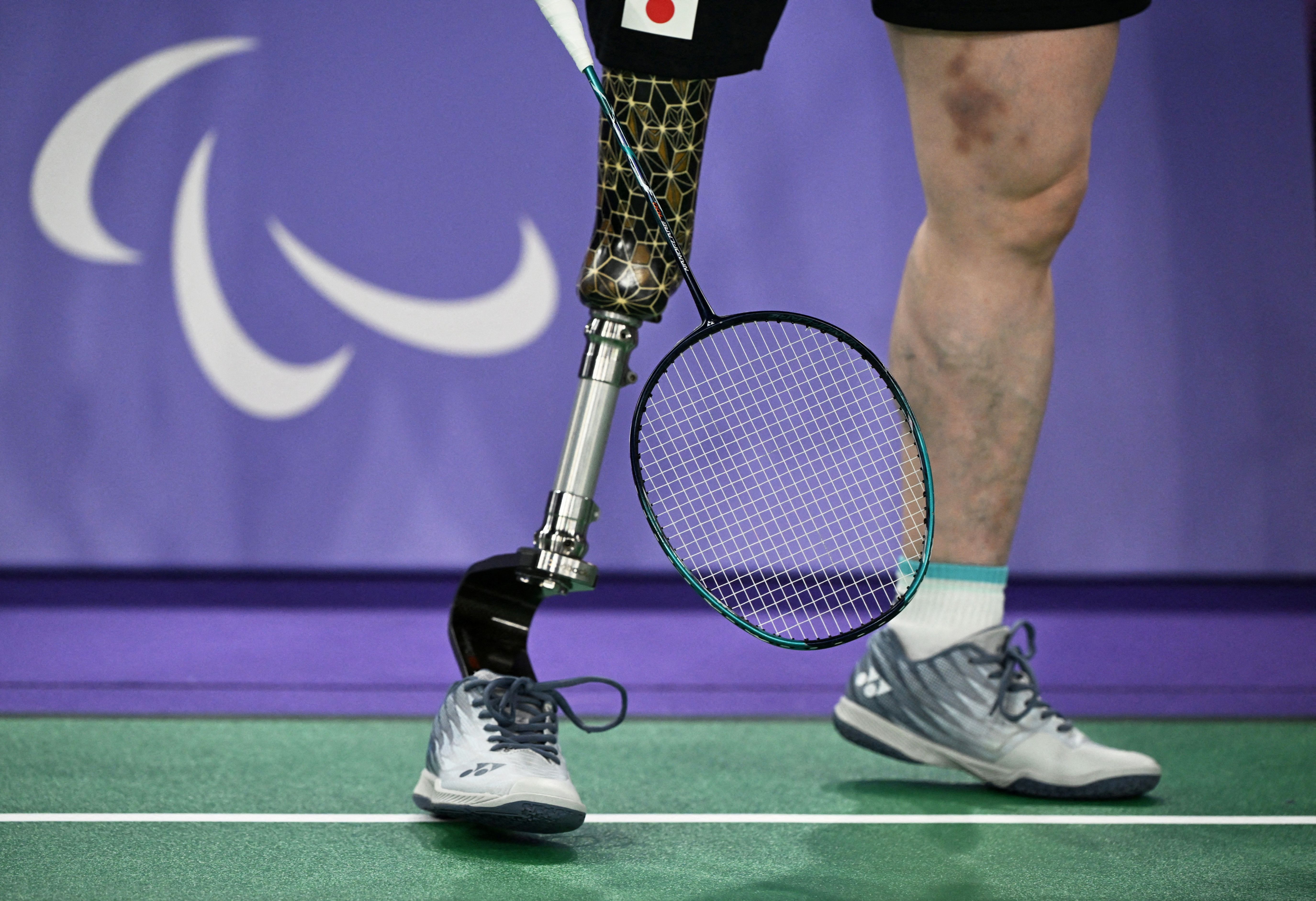 General view of the prosthetic leg of Noriko Ito of Japan during her match against Halime Yildiz of Turkey in women's singles badminton SL3, during the Paris Paralympic on August 29, 2024. (Photo by Jennifer Lorenzini/Reuters)