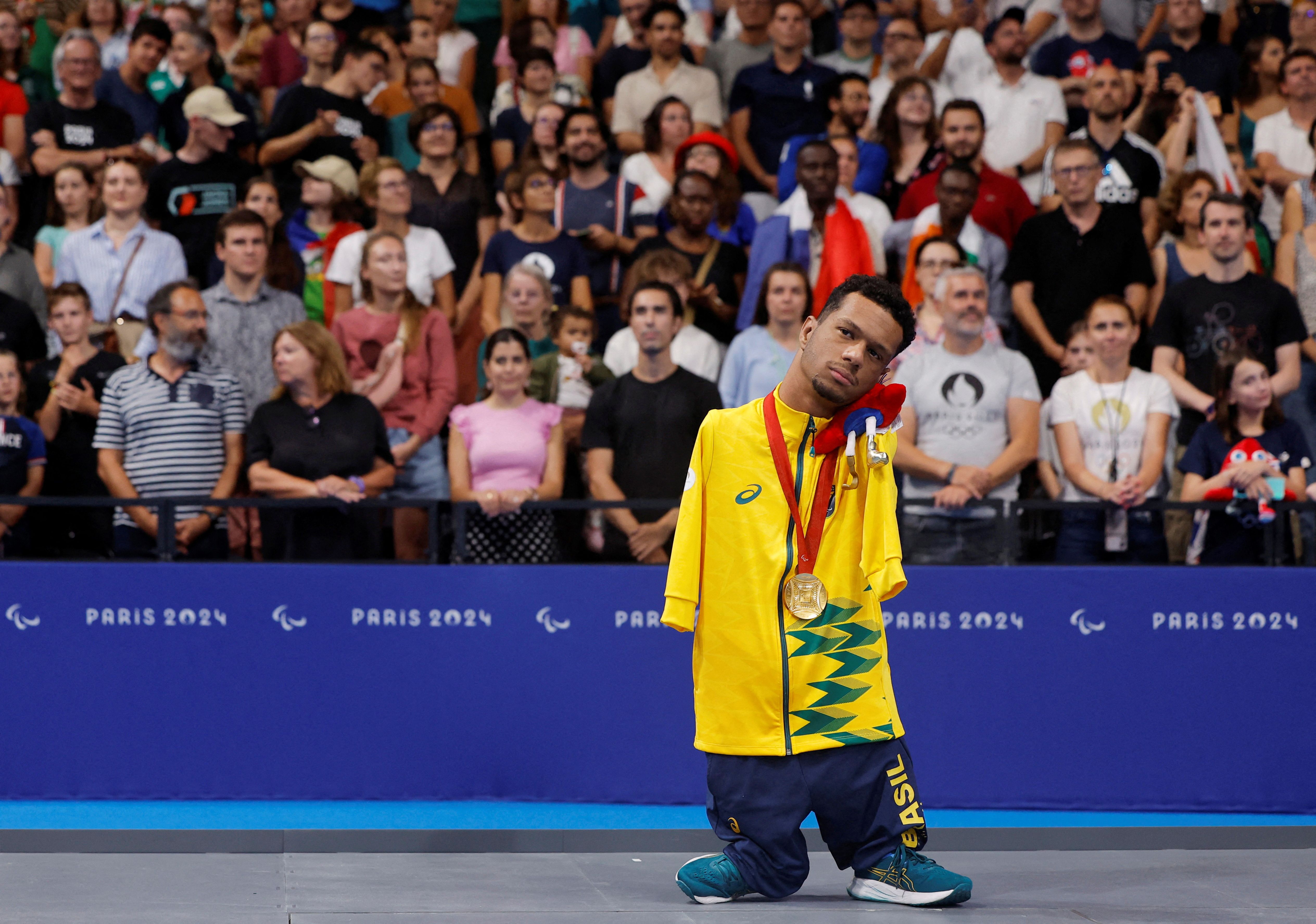 Gold medallist Gabriel Geraldo dos Santos Araujo of Brazil celebrates winning the final of the men's 100m S2 backstroke in Nanterre, France on August 29, 2024. (Photo by Andrew Couldridge/Reuters)