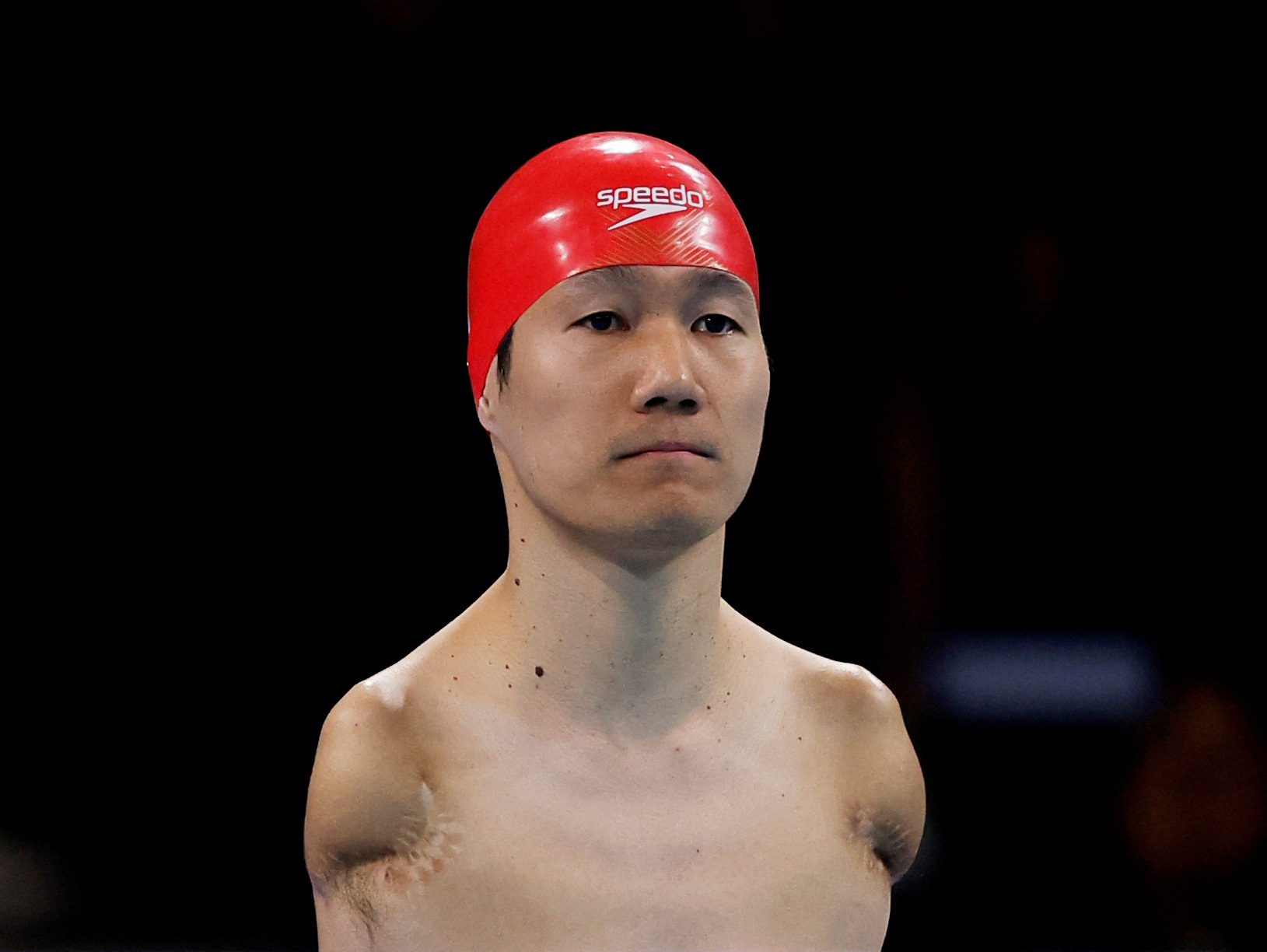 Lichao Wang of China ahead of heat 1 in men's 200m freestyle swimming in Nanterre, France on August 29, 2024. (Photo by Andrew Couldridge/Reuters)