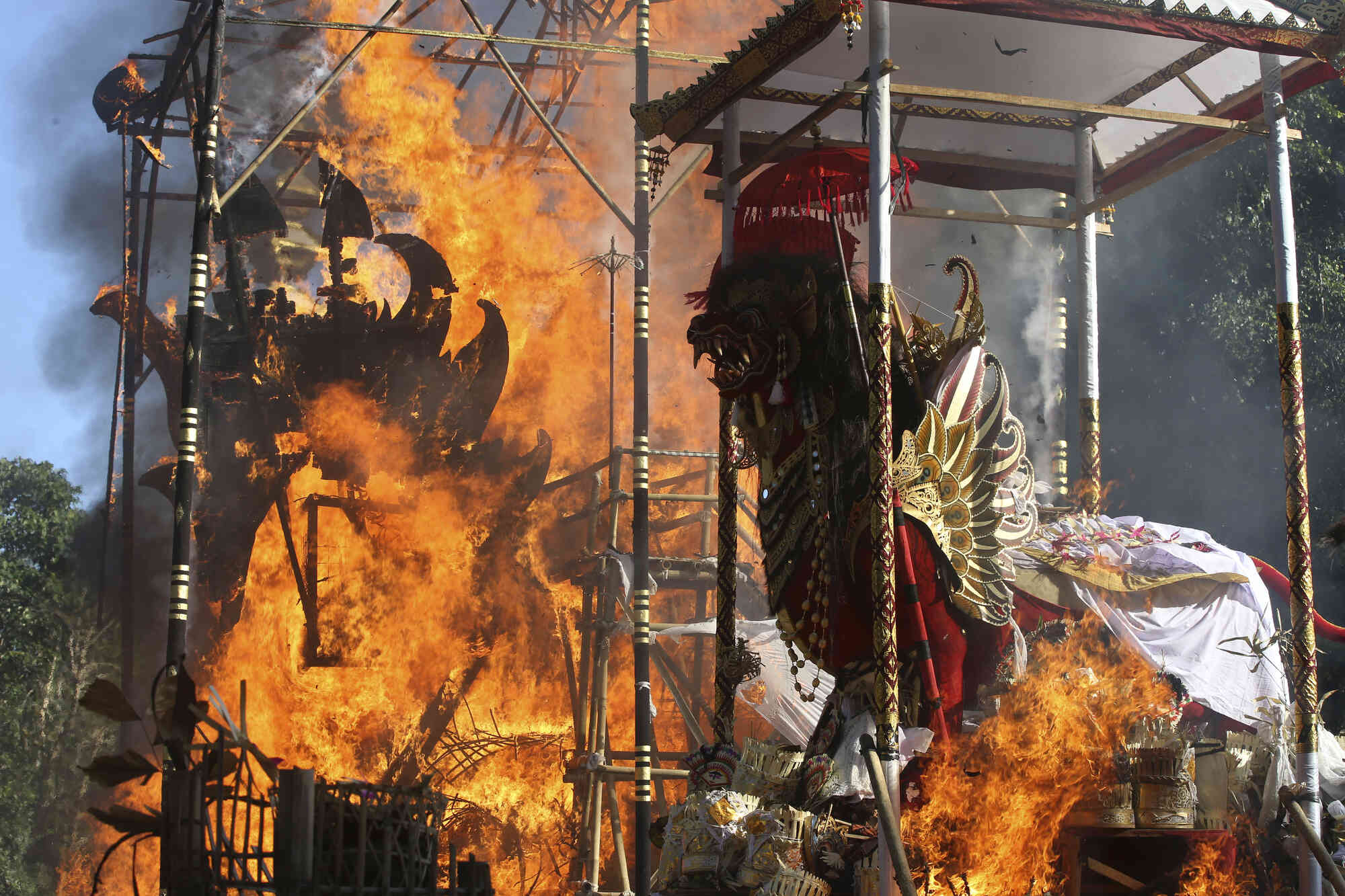 Fire engulfs giant effigy of mythical animals containing the remains of 220 people during traditional mass cremation called ''ngaben'' on Wednesday, August 14, 2024, in Manggis, Bali, Indonesia. (Photo by Firdia Lisnawati/AP Photo)