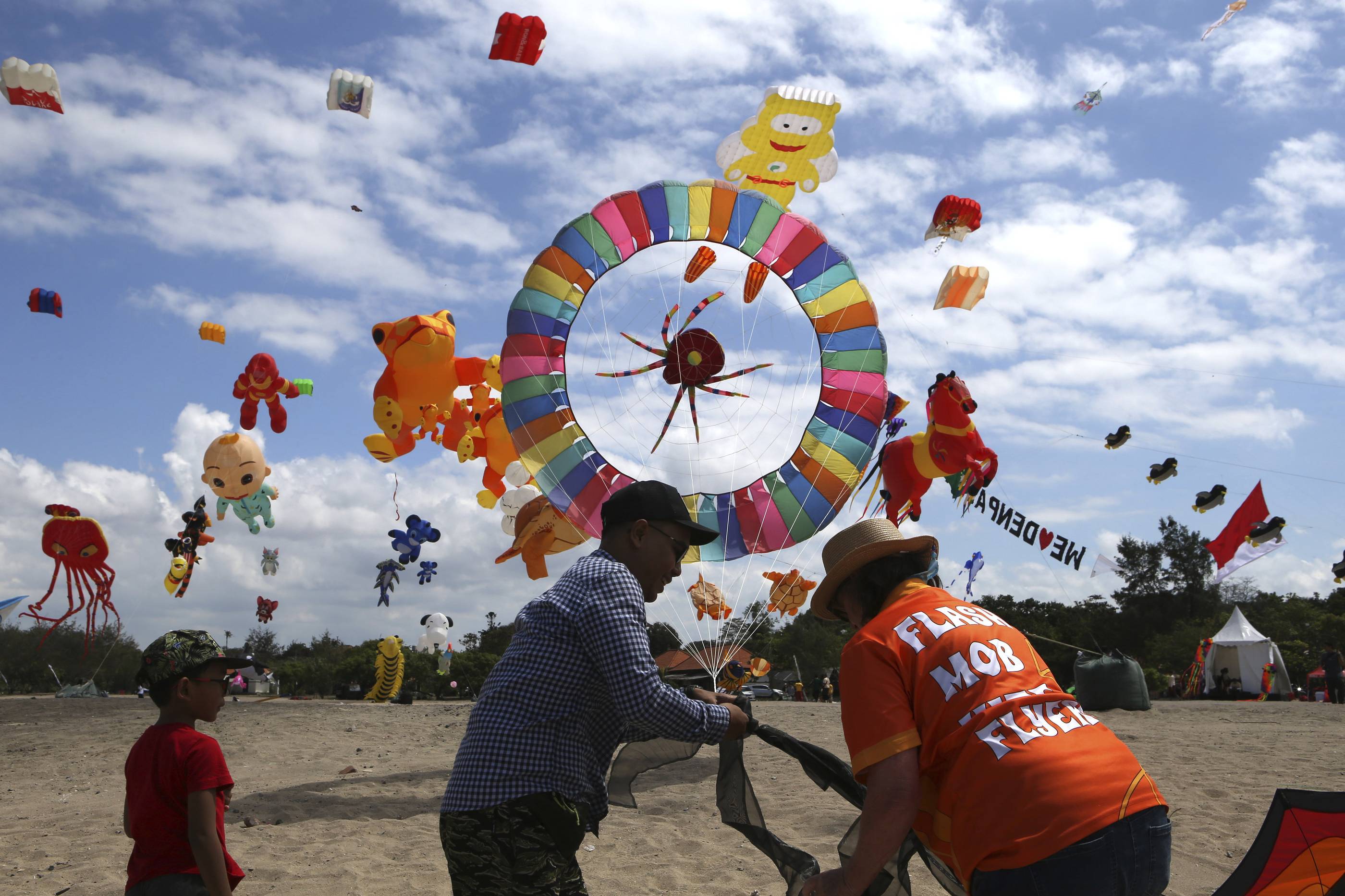 Participants prepare a kite during Denpasar international kite festival in Sanur, Bali, Indonesia Friday, August 16, 2024. (Photo by Firdia Lisnawati/AP Photo)