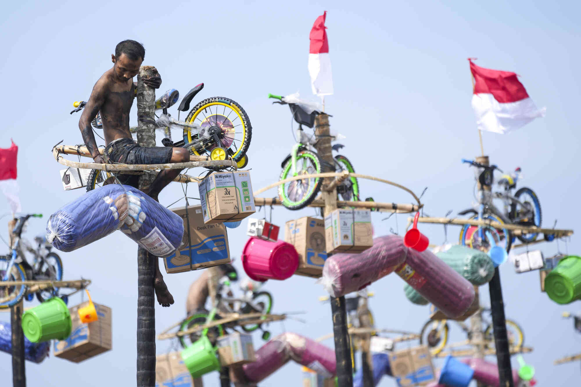 A participant retrieves prizes after climbing up a pole in a greased-pole climbing competition during the 79th Independence Day anniversary at Ancol Beach in Jakarta, Indonesia, Saturday, August 17, 2024, celebrating its independence from the Dutch colonial rule. (Photo by Tatan Syuflana/AP Photo)