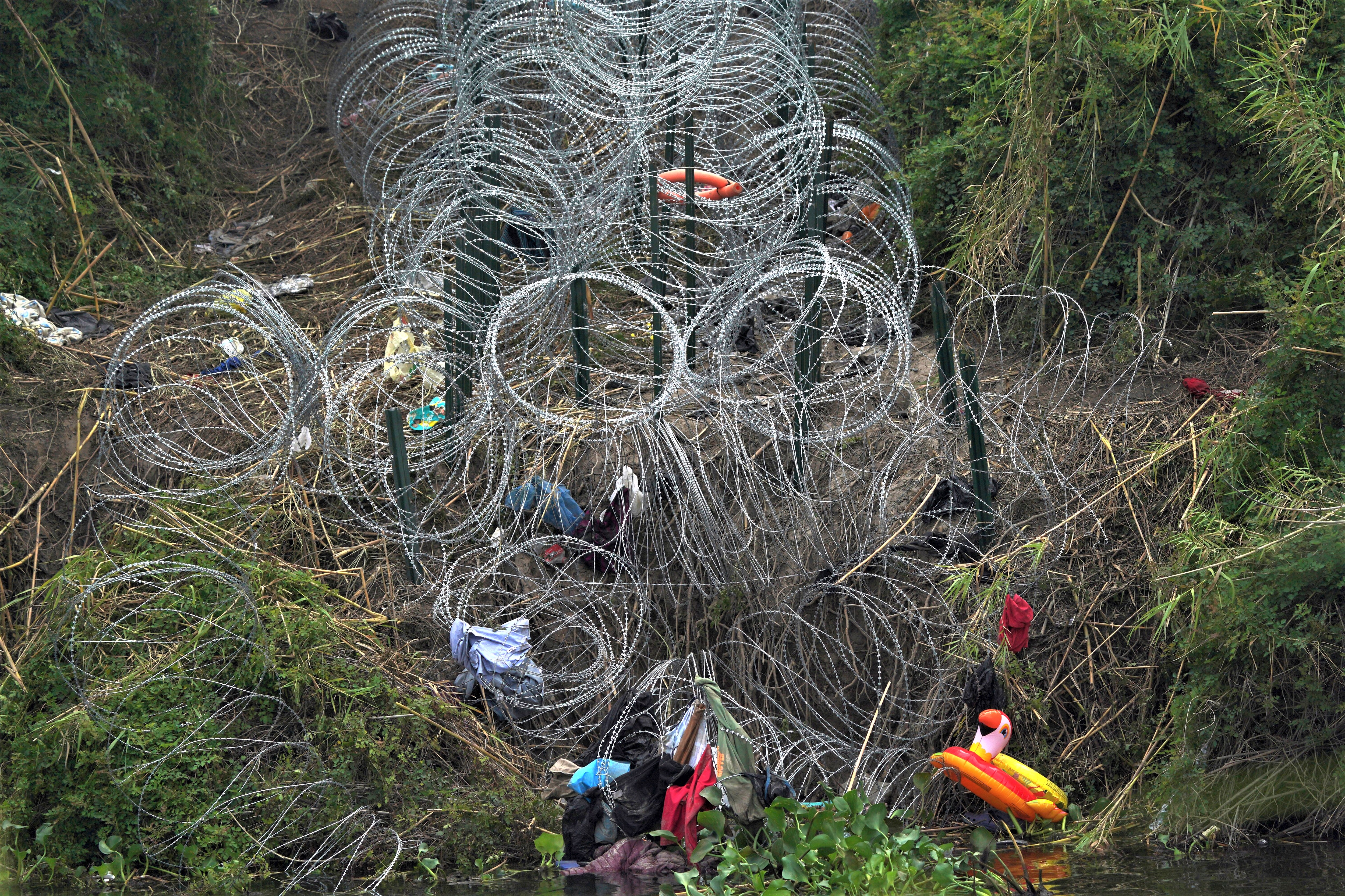 Razor wire and items left behind by migrants cover the U.S. side of the Rio Grande river, empty of migrants swimming across the river the morning after U.S. pandemic-related asylum restrictions called Title 42 were lifted, seen from Matamoros, Mexico, Friday, May 12, 2023. (Photo by Fernando Llano/AP Photo)