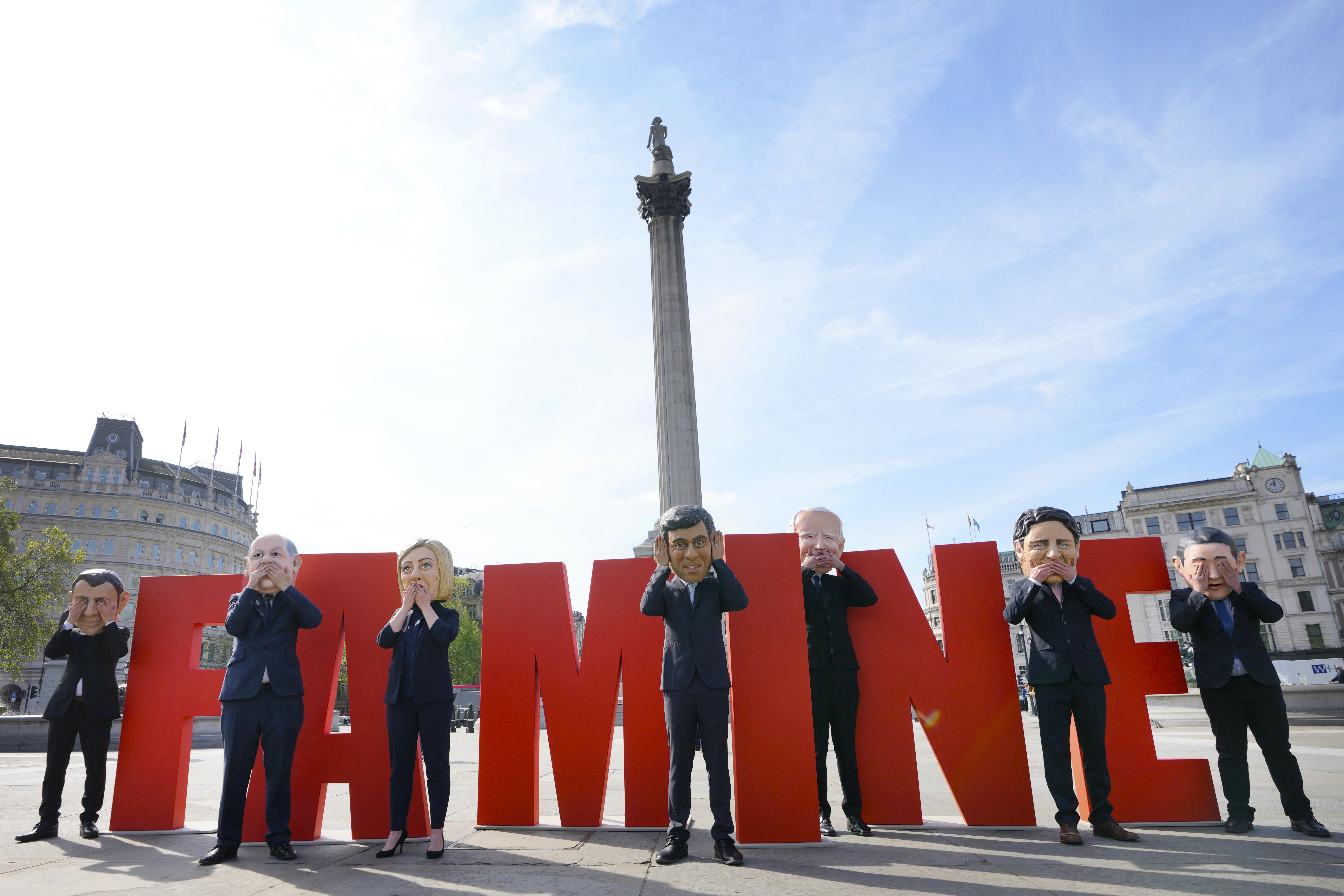 Oxfam's satirical “big heads” of the G7 leaders pose in Trafalgar Square, London, Wednesday, May 17, 2023, ahead of the start of the G7 summit in Japan. Britain's Prime Minister Rishi Sunak and the other G7 leaders 'big heads' made an appearance in London's Trafalgar Square to highlight their lack of action to tackle the East Africa hunger crisis, despite G7 leaders' promise to end famine when they met in the UK two years ago. (Photo by Kirsty Wigglesworth/AP Photo)
