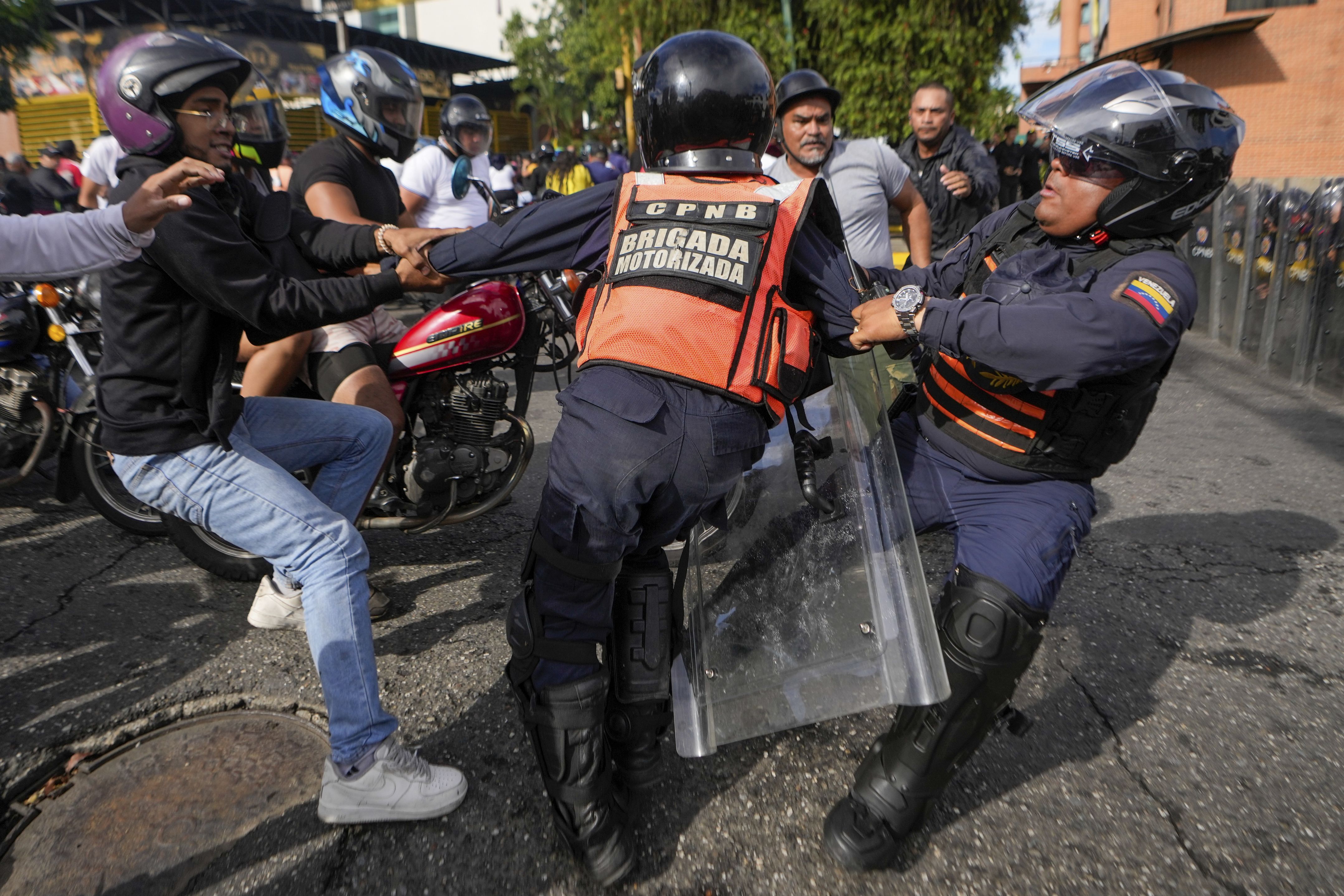 A protester scuffles with police during demonstrations against the official election results declaring President Nicolas Maduro's reelection, the day after the vote in Caracas, Venezuela, Monday, July 29, 2024. (Photo by Matias Delacroix/AP Photo)