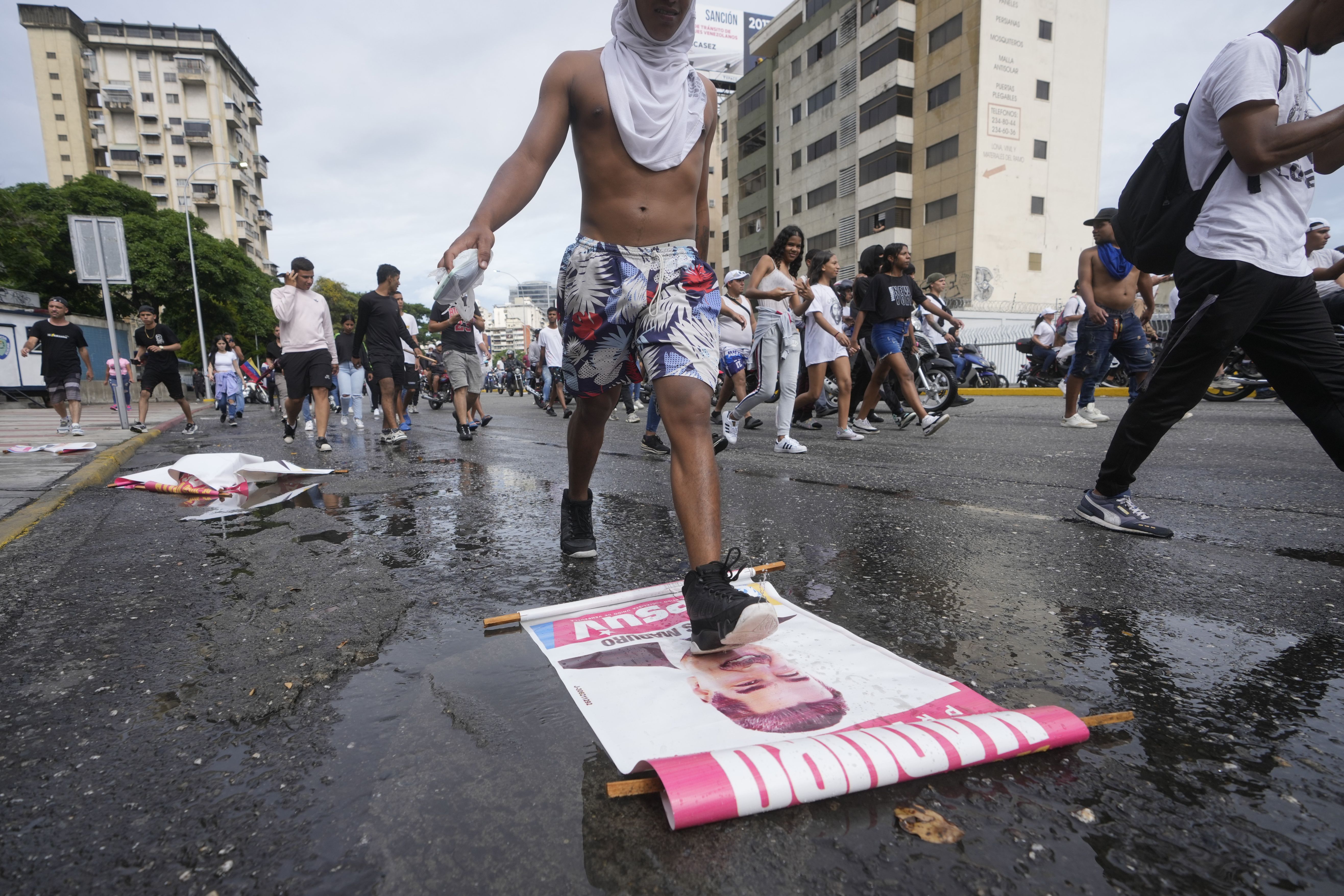A protester steps on a campaign sign of President Nicolas Maduro during a march against hish being declared the winner of the presidential election, the day after the vote in Caracas, Venezuela, Monday, July 29, 2024. (Photo by Fernando Vergara/AP Photo)