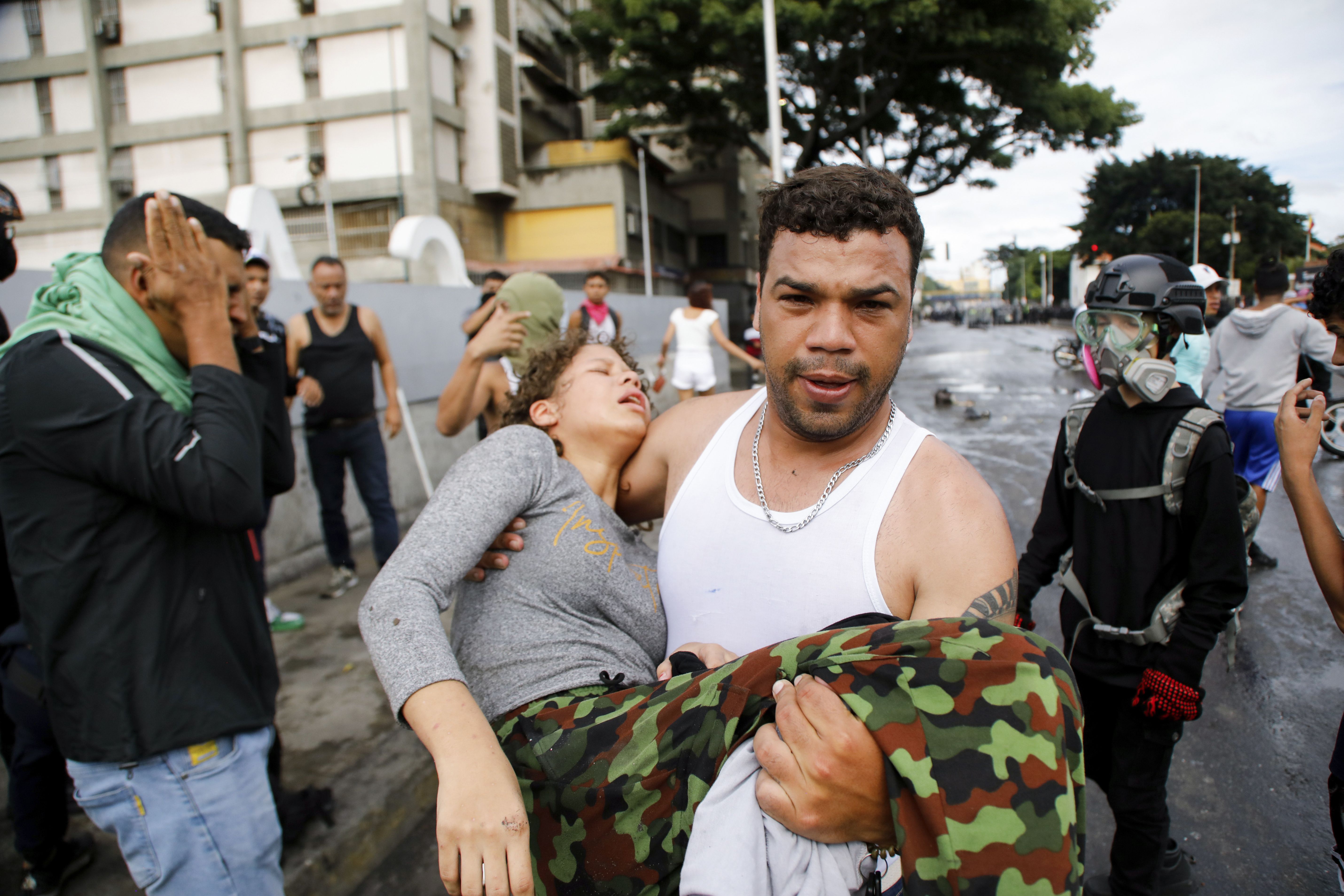A man carries a protester affected by tear gas thrown by police during demonstrations against the official election results declaring President Nicolas Maduro's reelection, the day after the vote, in the Caria neighborhood of Caracas, Venezuela, Monday, July 29, 2024. (Photo by Cristian Hernandez/AP Photo)