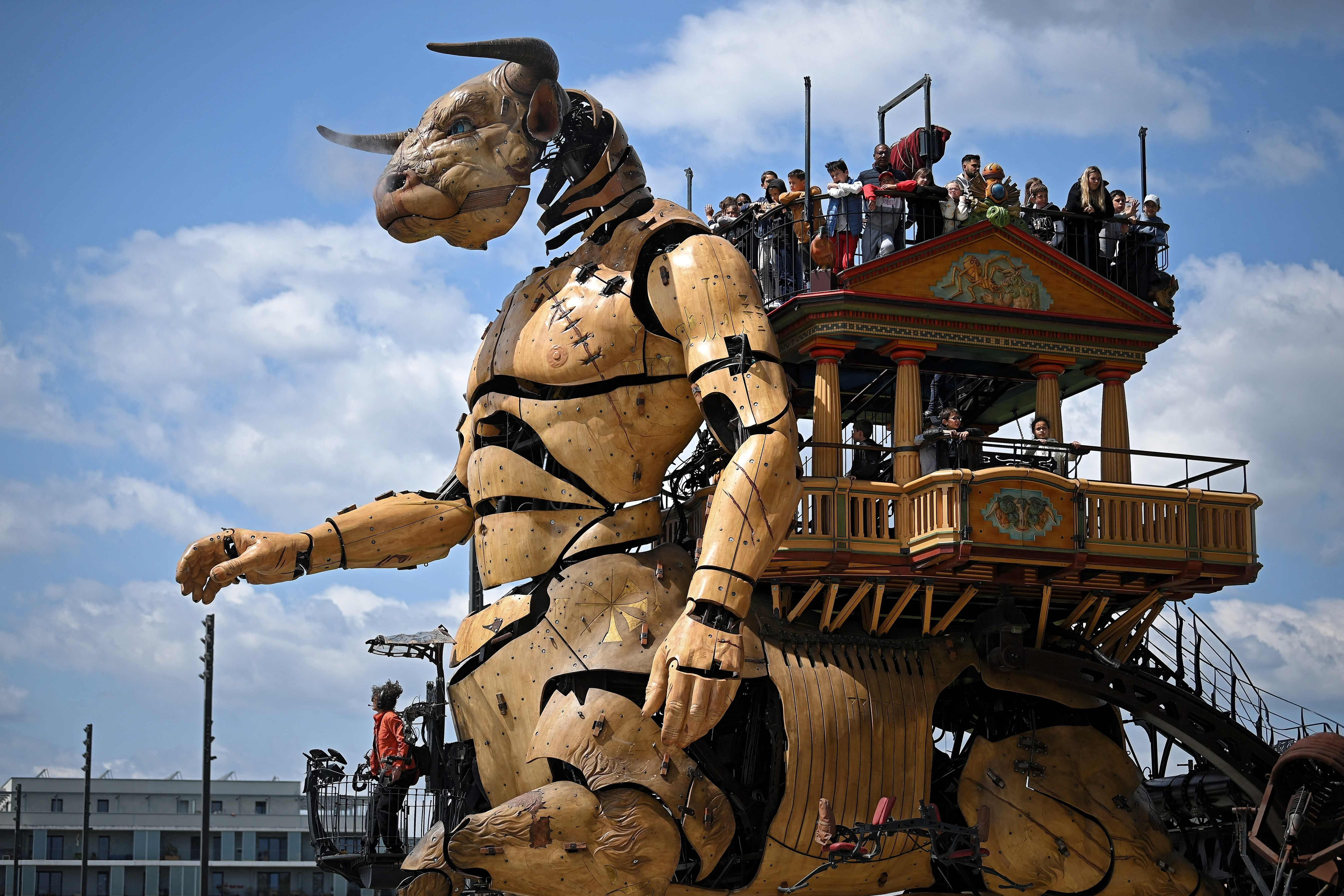 Asterion, a minotaur weighing 47 tons and 13 meters high made by “La Machine” street theatre company, moves through the Montaudran district in Toulouse, southwestern France, guided by a team of machinists on May 17, 2023. Founded in 1999 the company was born from the collaboration of artists, technicians and show decorators and is known for its theatrical machines, permanent installations, and theatrical productions. (Photo by Valentine Chapuis/AFP Photo)